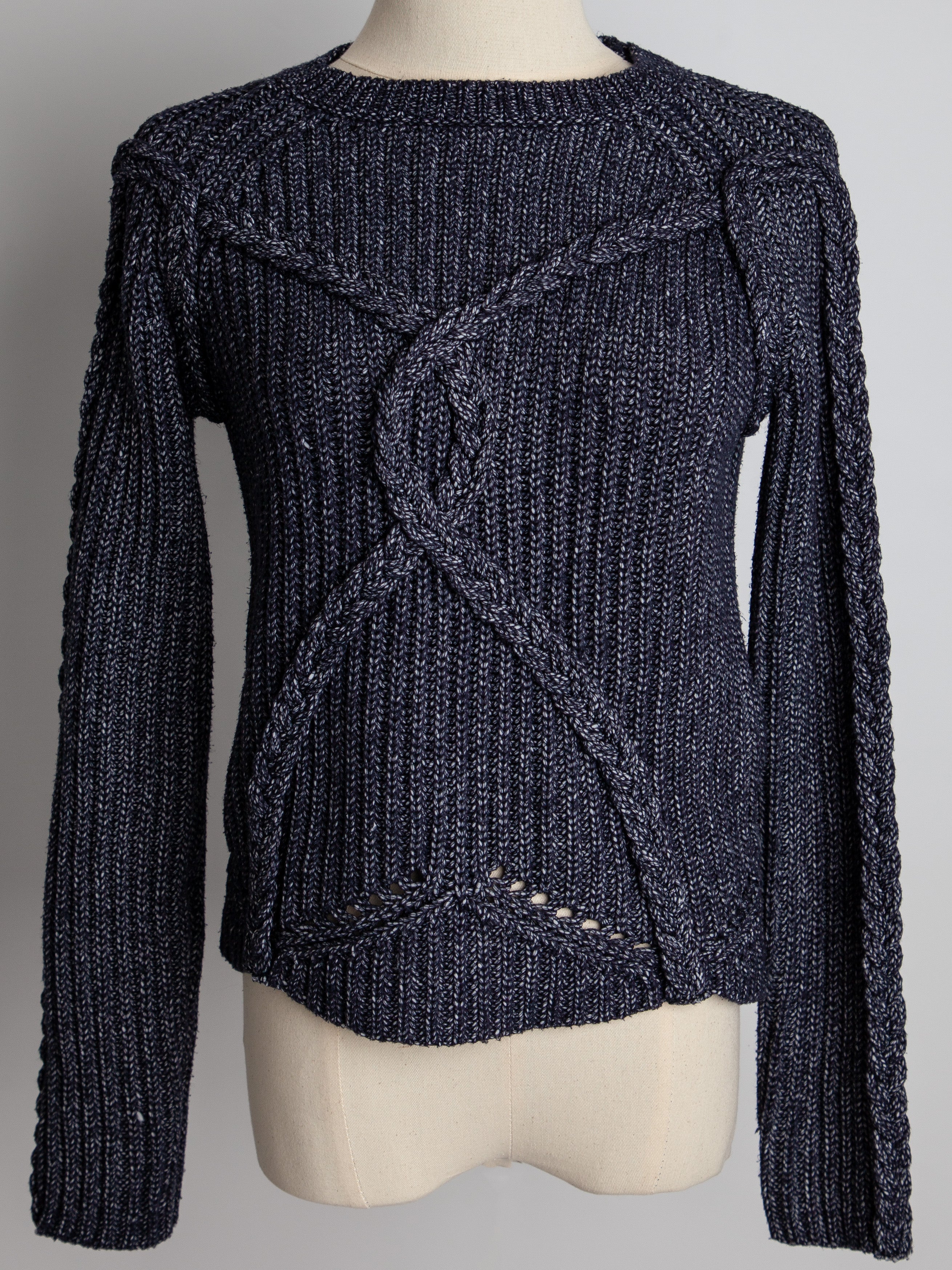 Featuring a unique cable knit pattern on the front, this navy blue long-sleeve sweater is both stylish and comfortable, perfect for layering during the colder months.