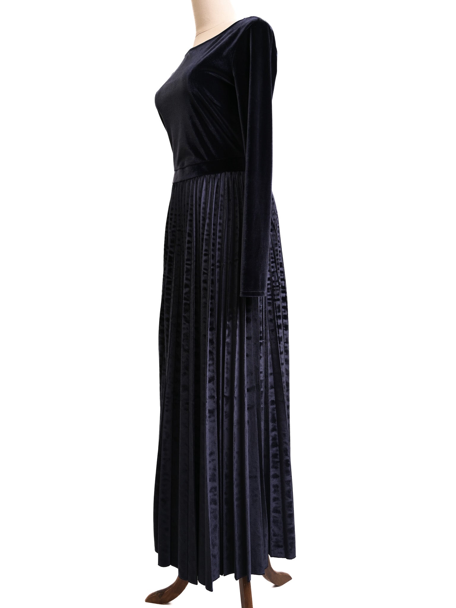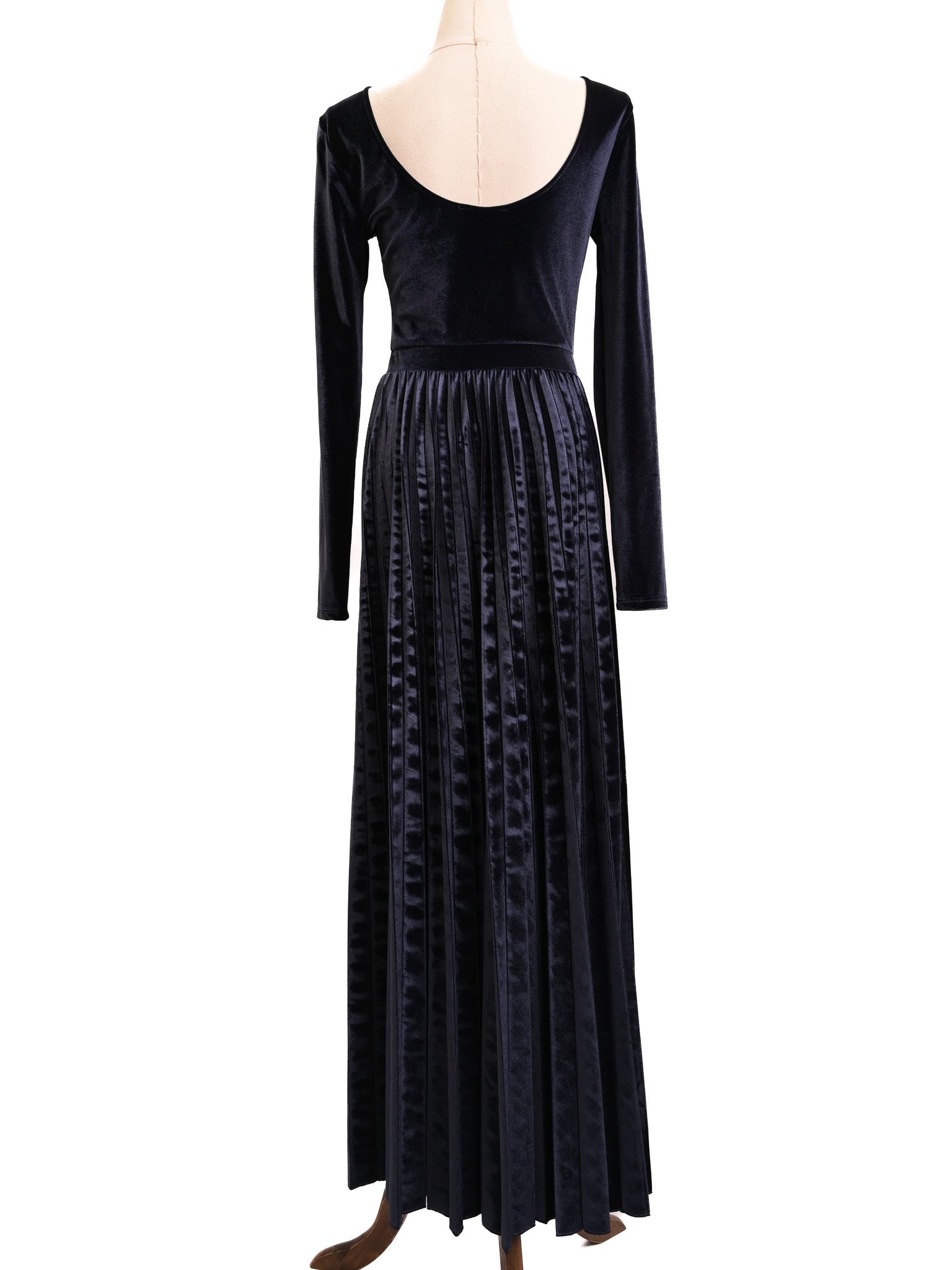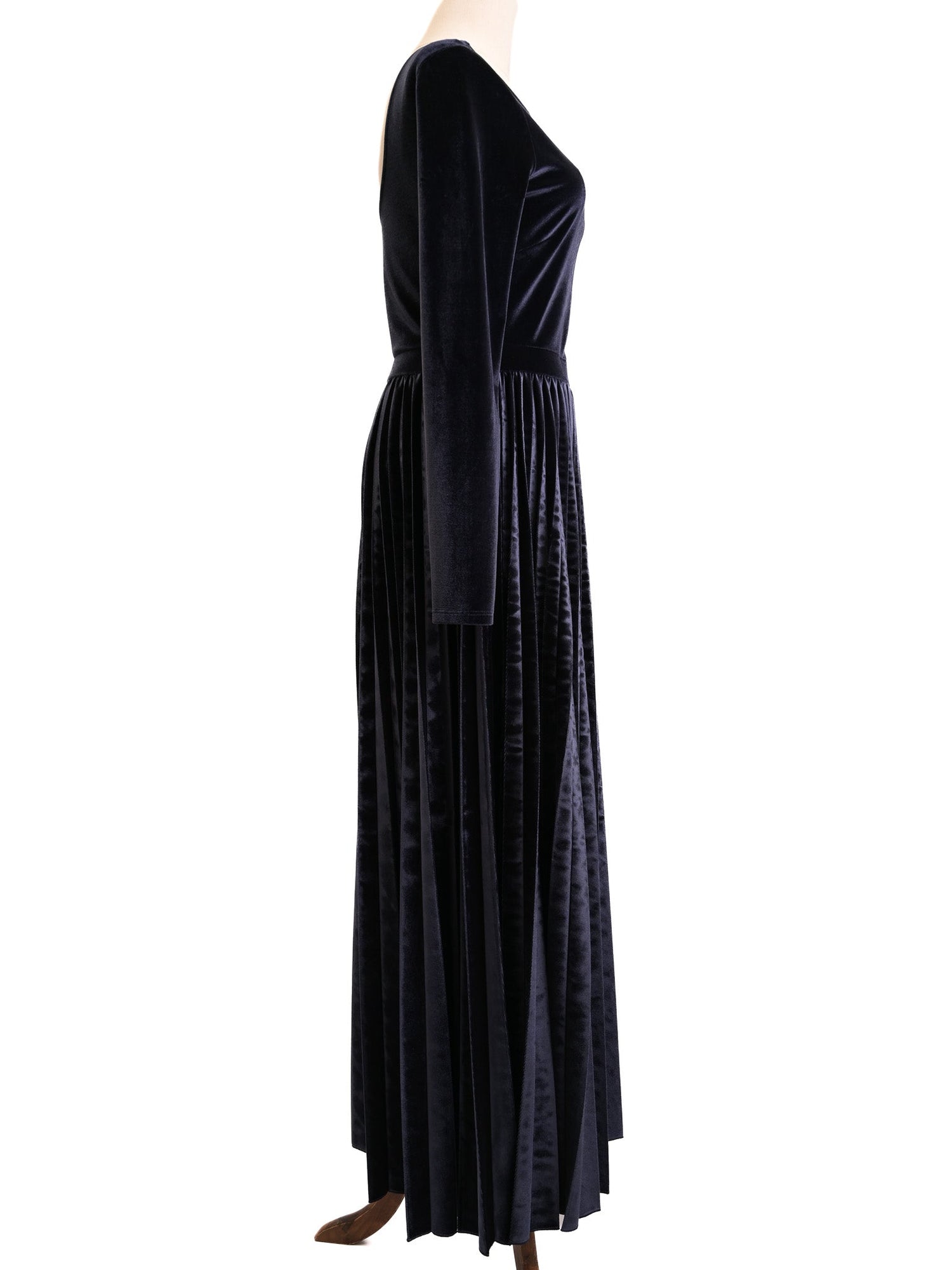 The dress showcases a pleated skirt that flows beautifully, enhancing its graceful demeanor. With a round neckline in the front and a deeper scoop in the back, this dress balances modesty with allure.
