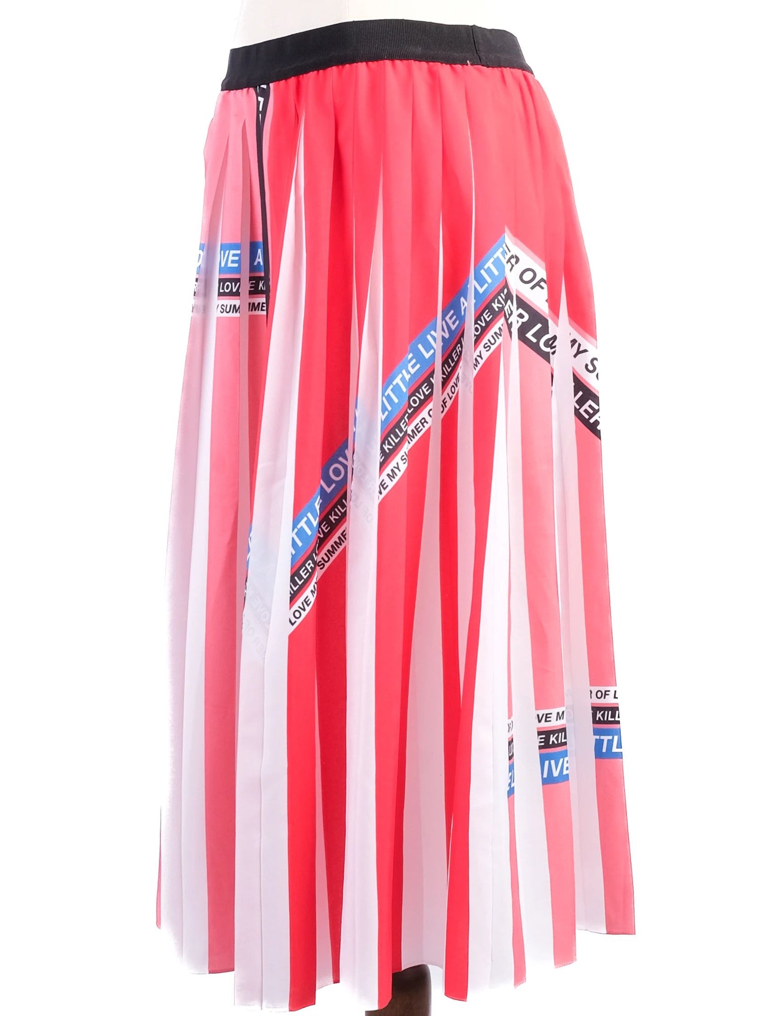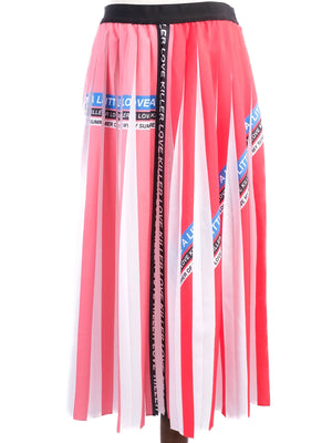 Excellent Pinko Pleated Skirt Red White Stripes Size L Made in Italy This stunning pleated skirt by PINKO features bold red and white vertical stripes, accentuated with lively text patterns in blue and black. Key phrases such as 'LIVE A LITTLE,' 'LOVE,' and 'KILLER LOVE' make a striking statement, embodying a fun and playful vibe. Size L, this skirt fits true to size and is made from 100% polyester, ensuring comfort and durability. The intricate pleating adds to its overall flair, making it a perfect choice for both casual outings and semi-casual events. The label states 'HOLLYWOOD IN LOVE,' and it is proudly made in Italy, reflecting PINKO's commitment to quality and design. Care instructions recommend dry cleaning to maintain its pristine condition. With its fashionable print and chic silhouette, this skirt is an essential addition to any modern woman's wardrobe. Smoke-free and pet-free home. Elevate your style with this distinctive piece! Please message me to confirm shipping timeframe. My full-time job involves traveling often, and shipping out may take longer than usual. Thanks for your interest.
