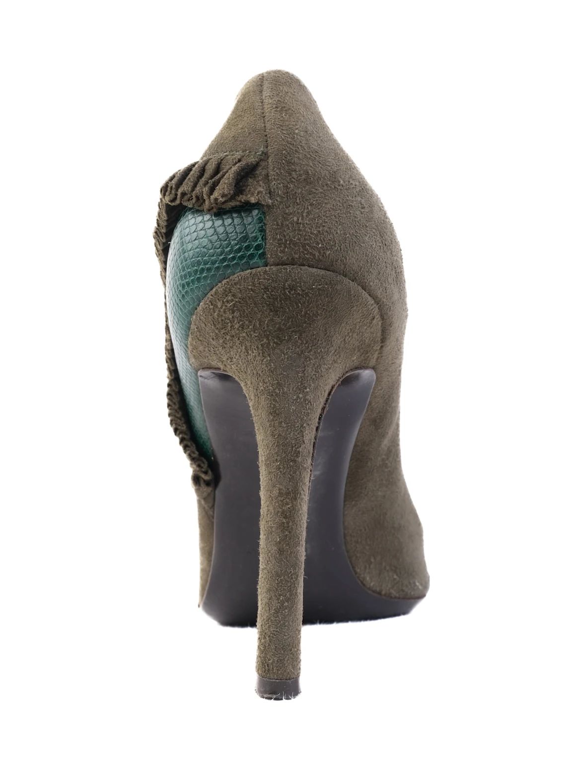 EXCELLENT Valentino Green Stiletto Heels Leather Open Toe Floral Embellishment Step into elegance with these stunning Valentino stiletto heels, designed exclusively for women. The beautiful green leather exterior features a luxurious suede appearance, making these shoes a standout addition to any wardrobe. The open toe design enhances breathability while the exquisite floral embellishment on the front adds a uniquely stylish touch. Condition: Excellent with no visible flaws. These heels are crafted with quality materials, featuring a leather upper and a durable sole, ensuring comfort and style for your feet. The textured detail at the back gives a sophisticated flair, possibly with a leather or reptile skin finish. Perfect for various occasions such as cocktail parties, evening events, or a night out, these Valentino heels will elevate any outfit. The stiletto heel adds height and elegance, making you feel confident and poised. Care instructions: Spot clean with a leather cleaner to maintain the pristine condition of these exquisite heels. Don't miss your chance to own these exclusive Valentino stiletto heels; they are sure to be a favorite for any fashion-forward individual! Please message me to confirm shipping timeframe. My full-time job involves traveling often, and shipping out may take longer than usual. Thanks for your interest.