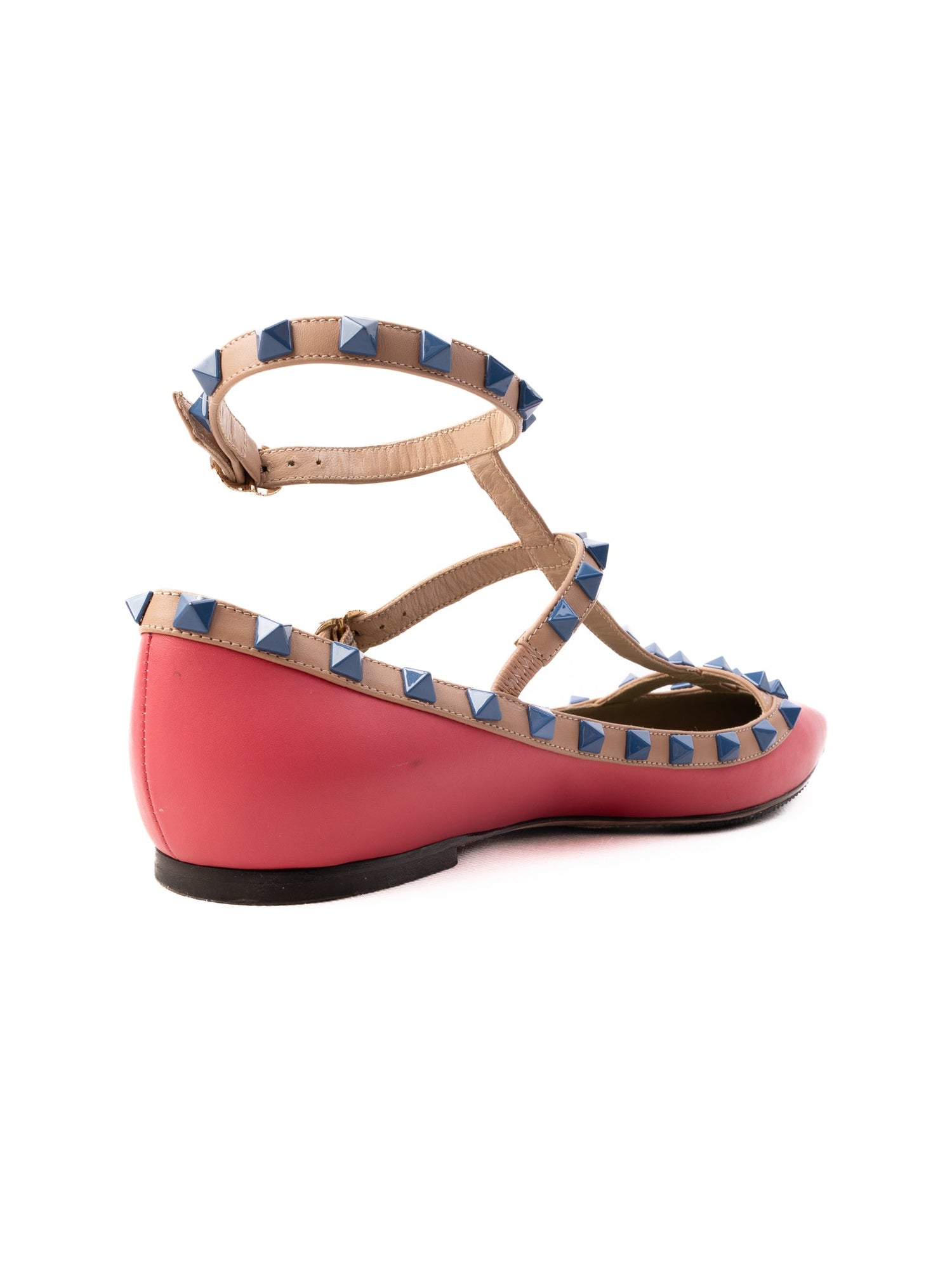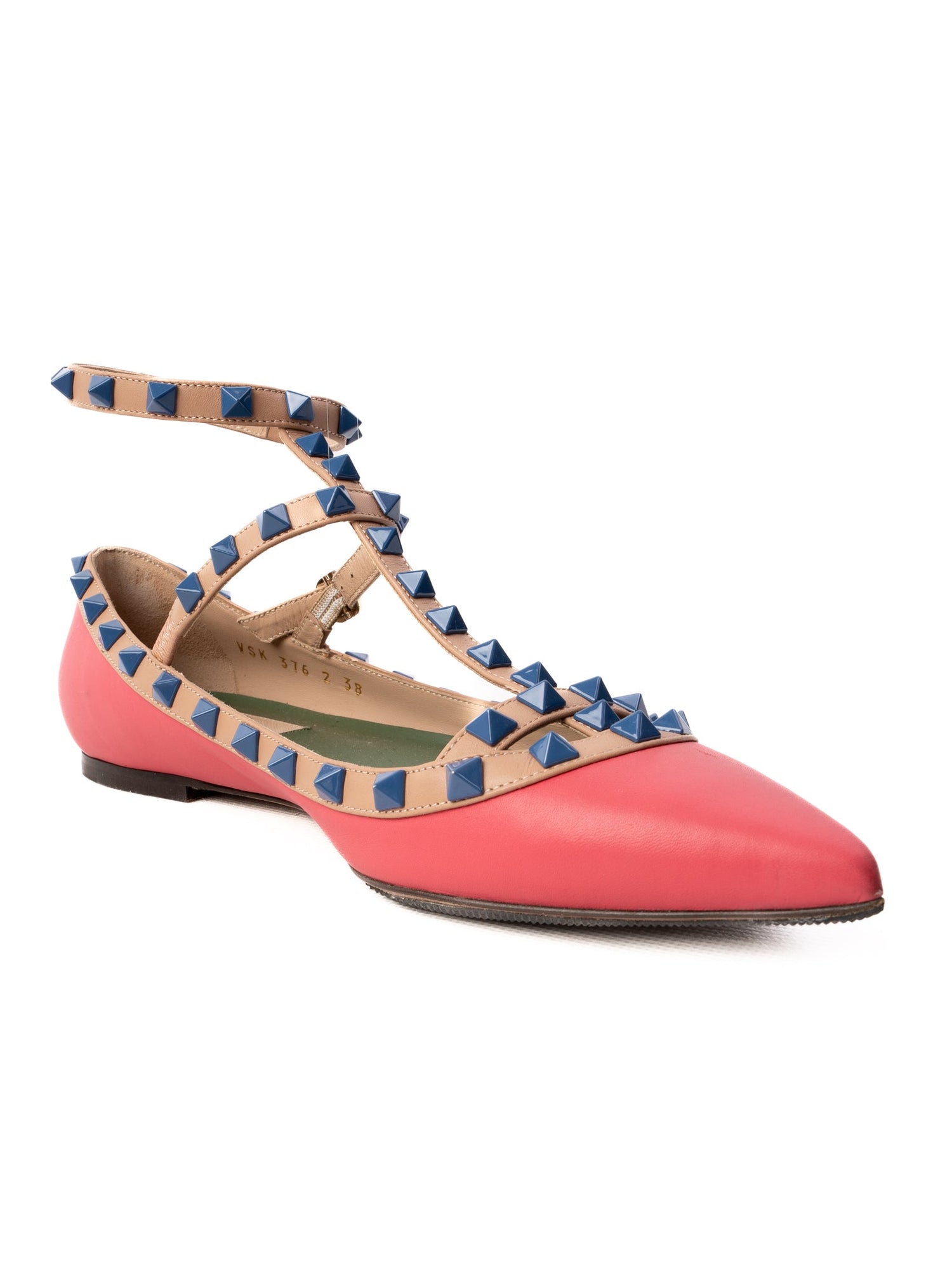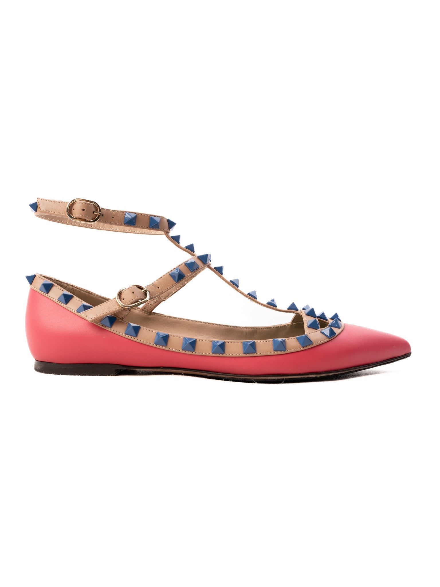 Step out in style with this exquisite pair of flat shoes from Valentino, boasting a vibrant pink leather exterior that's perfect for adding a pop of color to any outfit. These shoes feature a pointed toe design, complemented by multiple tan-colored straps adorned with stunning blue stud embellishments, merging elegance with edgy flair.