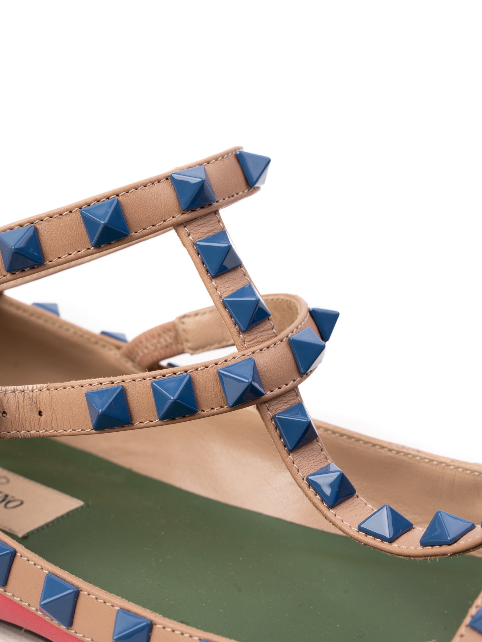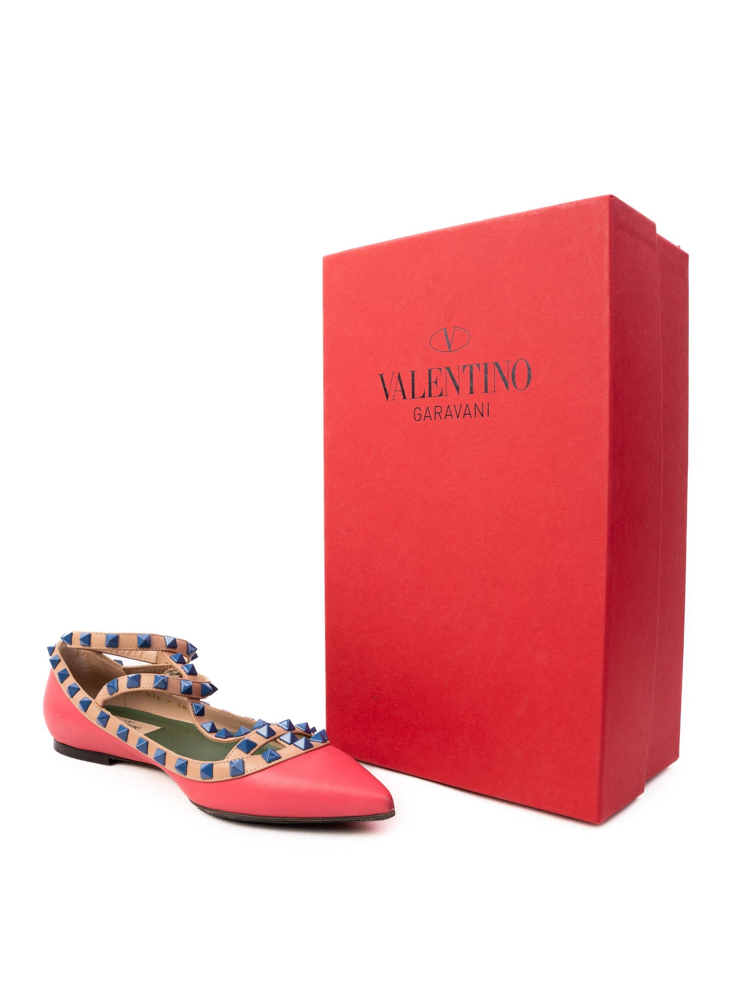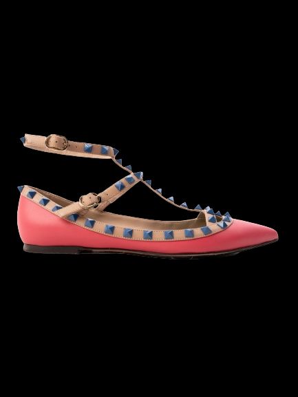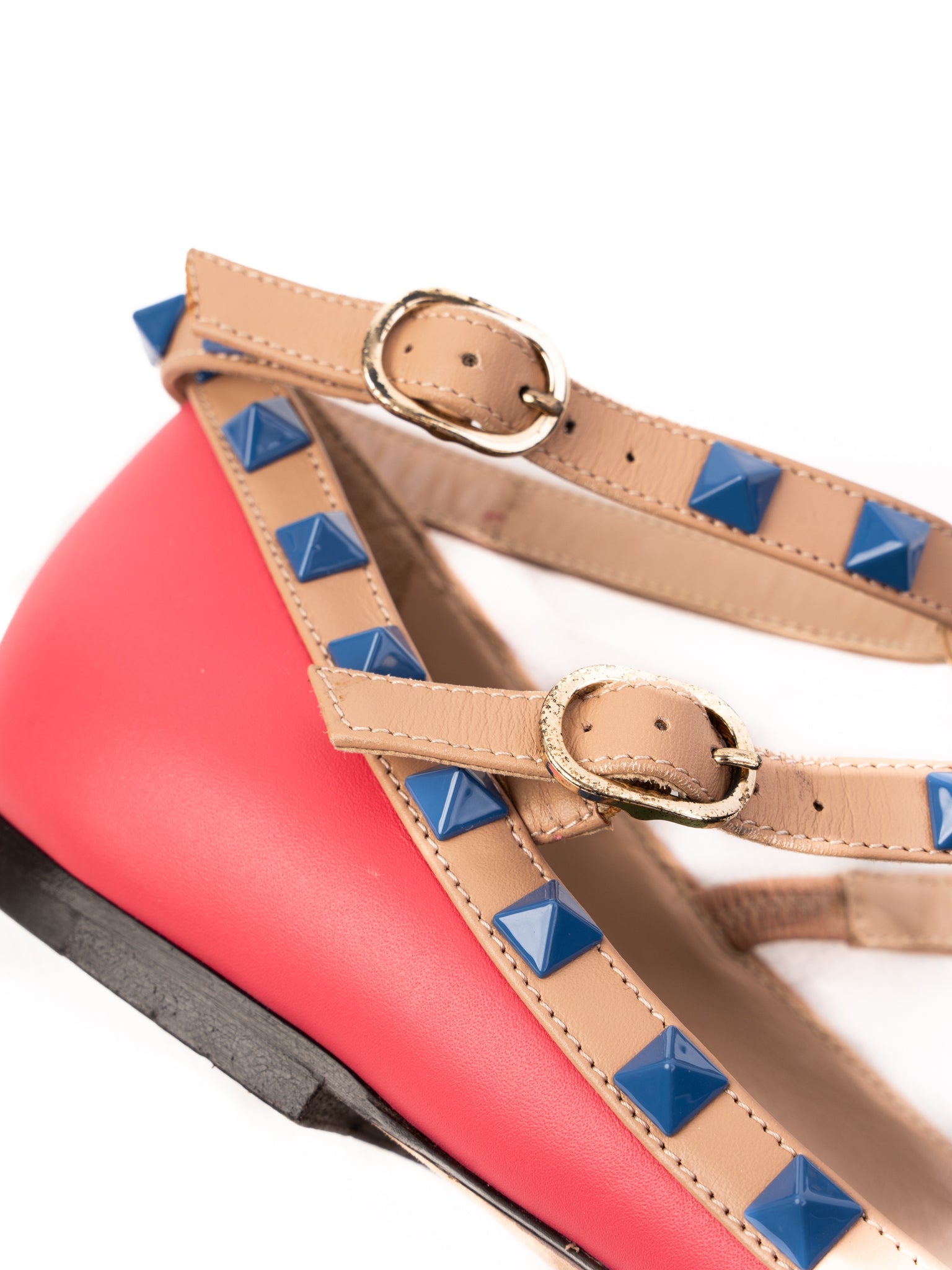 Step out in style with this exquisite pair of flat shoes from Valentino, boasting a vibrant pink leather exterior that's perfect for adding a pop of color to any outfit. These shoes feature a pointed toe design, complemented by multiple tan-colored straps adorned with stunning blue stud embellishments, merging elegance with edgy flair.