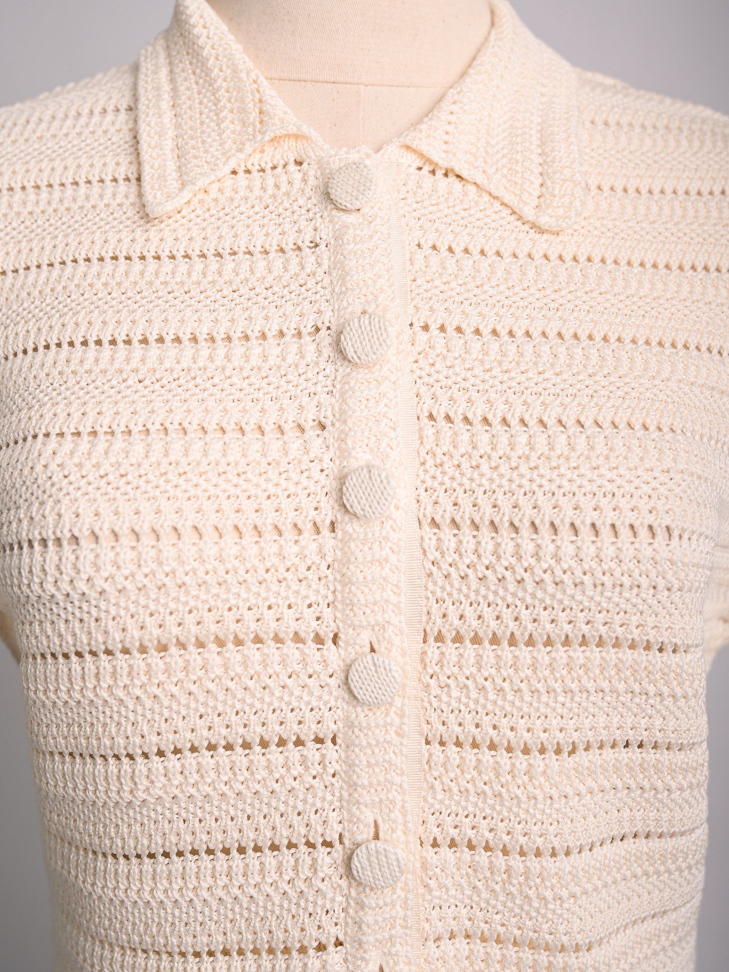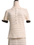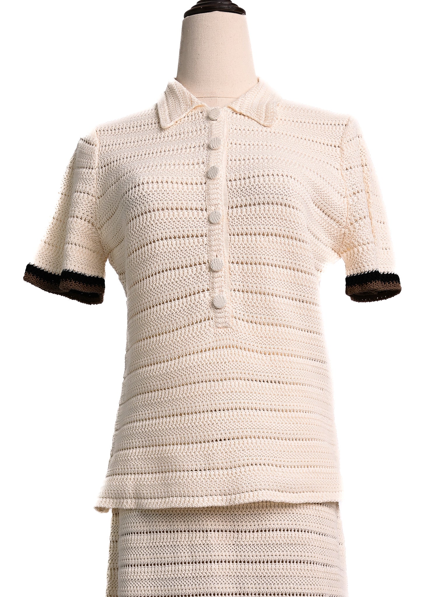 This exquisite Fendi top is in perfect condition, featuring a stylish design with short sleeves and buttons down the front. Crafted from high-quality natural cotton, it boasts a cream-colored hue complemented by chic black trim on the sleeves. The top is a part of a matching set, making it a splendid choice for any fashion-forward woman.