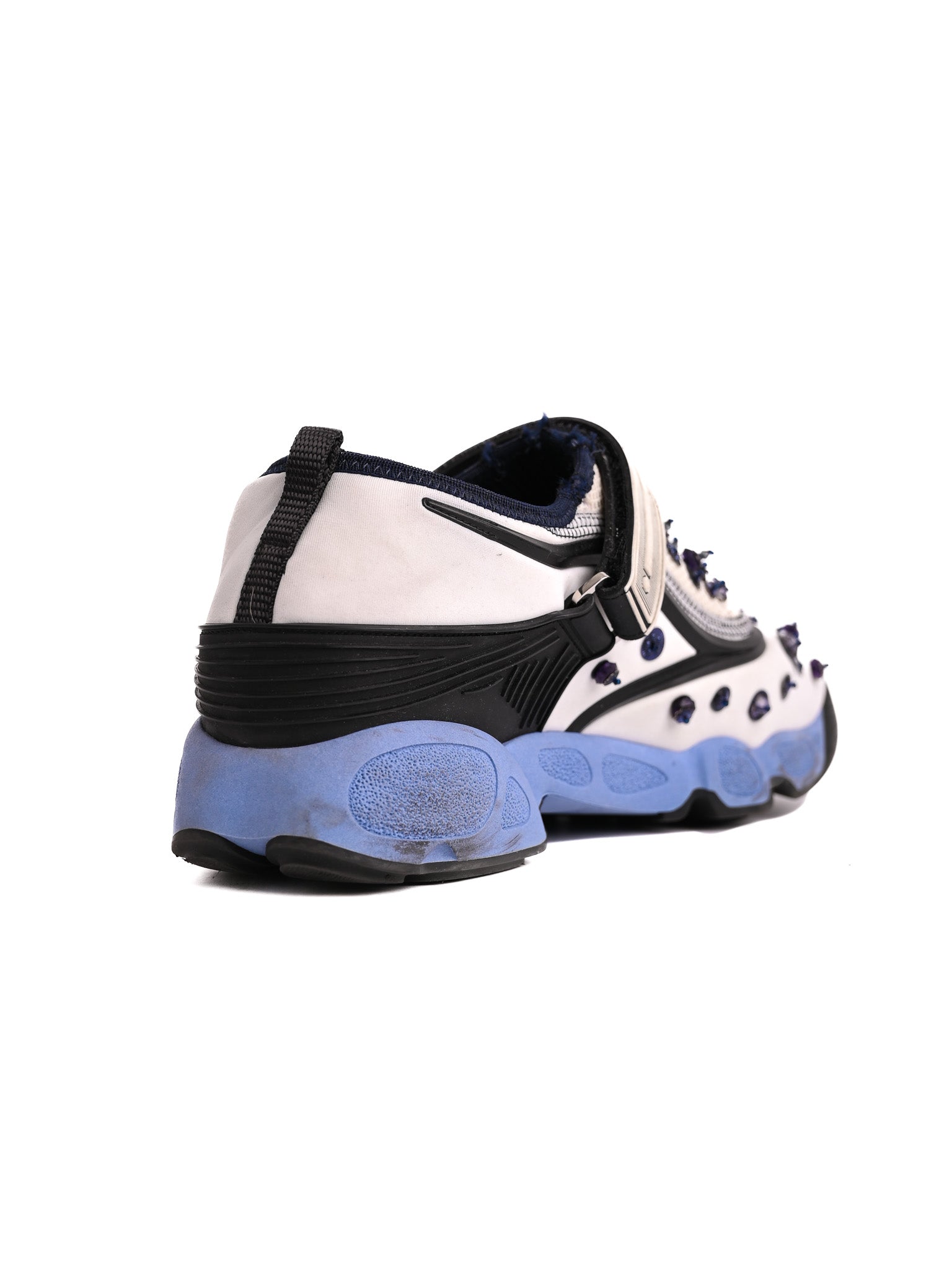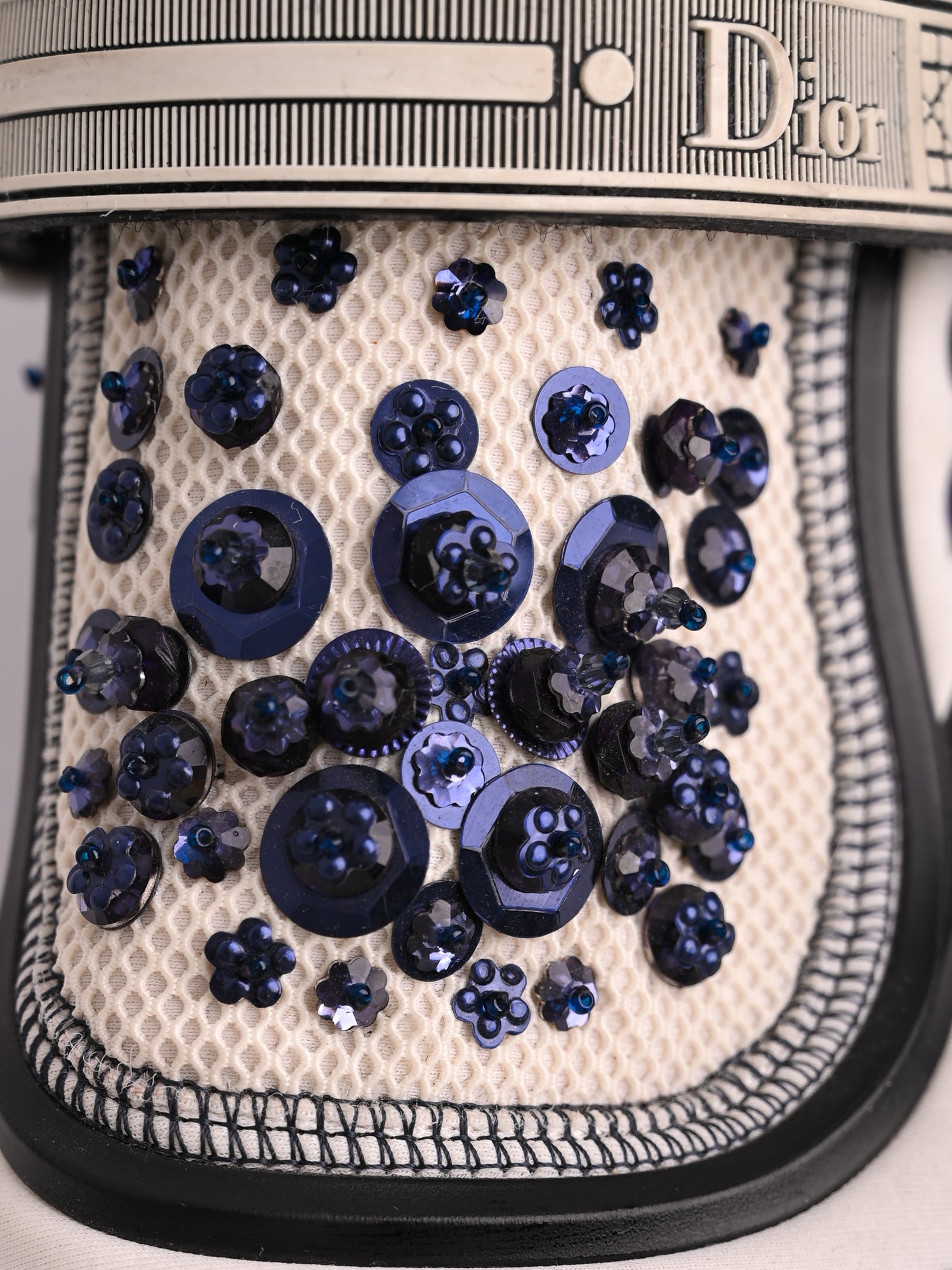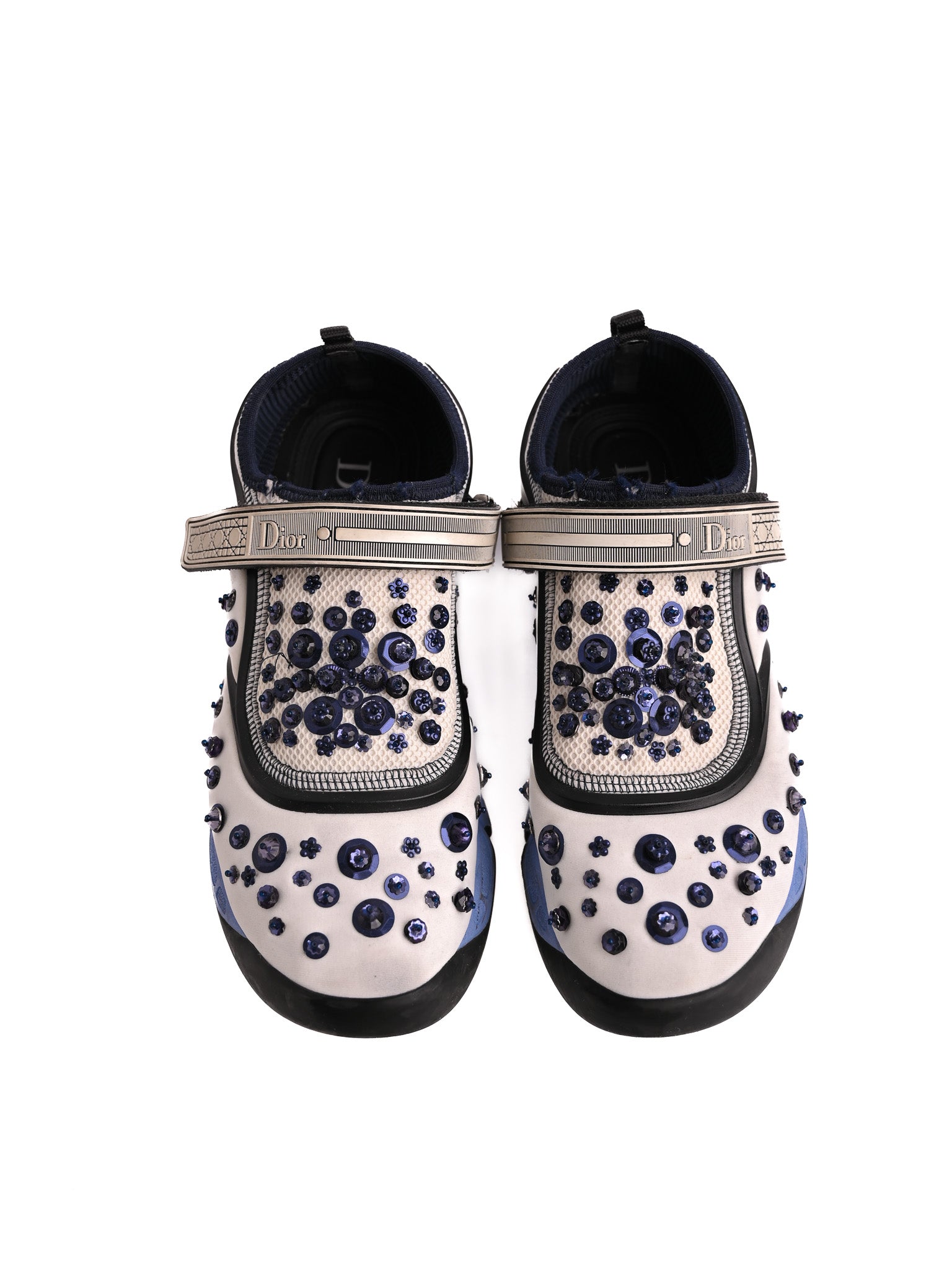 Good Dior Women's Sneakers Size 37 Combined Textile Unique Design These stunning Dior sneakers showcase a blend of style and comfort, perfect for any fashion-forward individual. The shoes feature a unique design with a sporty appearance, combining a white and black upper with striking blue accents. The prominently visible blue sole adds a bold touch, while embellishments such as decorative beads and sequins elevate the overall aesthetic. Condition is good, with only minor signs of wear. They fit true to size 37 and are crafted from high-quality textile materials, ensuring durability and breathability. The closure features a stylish strap across the top, providing a secure fit. For care, these sneakers can be spot cleaned to maintain their appearance. Ideal for casual outings or semi-casual gatherings, these Dior sneakers are a must-have for anyone seeking to enhance their footwear collection. Experience the perfect fusion of elegance and sporty design with these exquisite Dior sneakers. Please message me to confirm shipping timeframe. My full-time job involves traveling often, and shipping out may take longer than usual. Thanks for your interest.