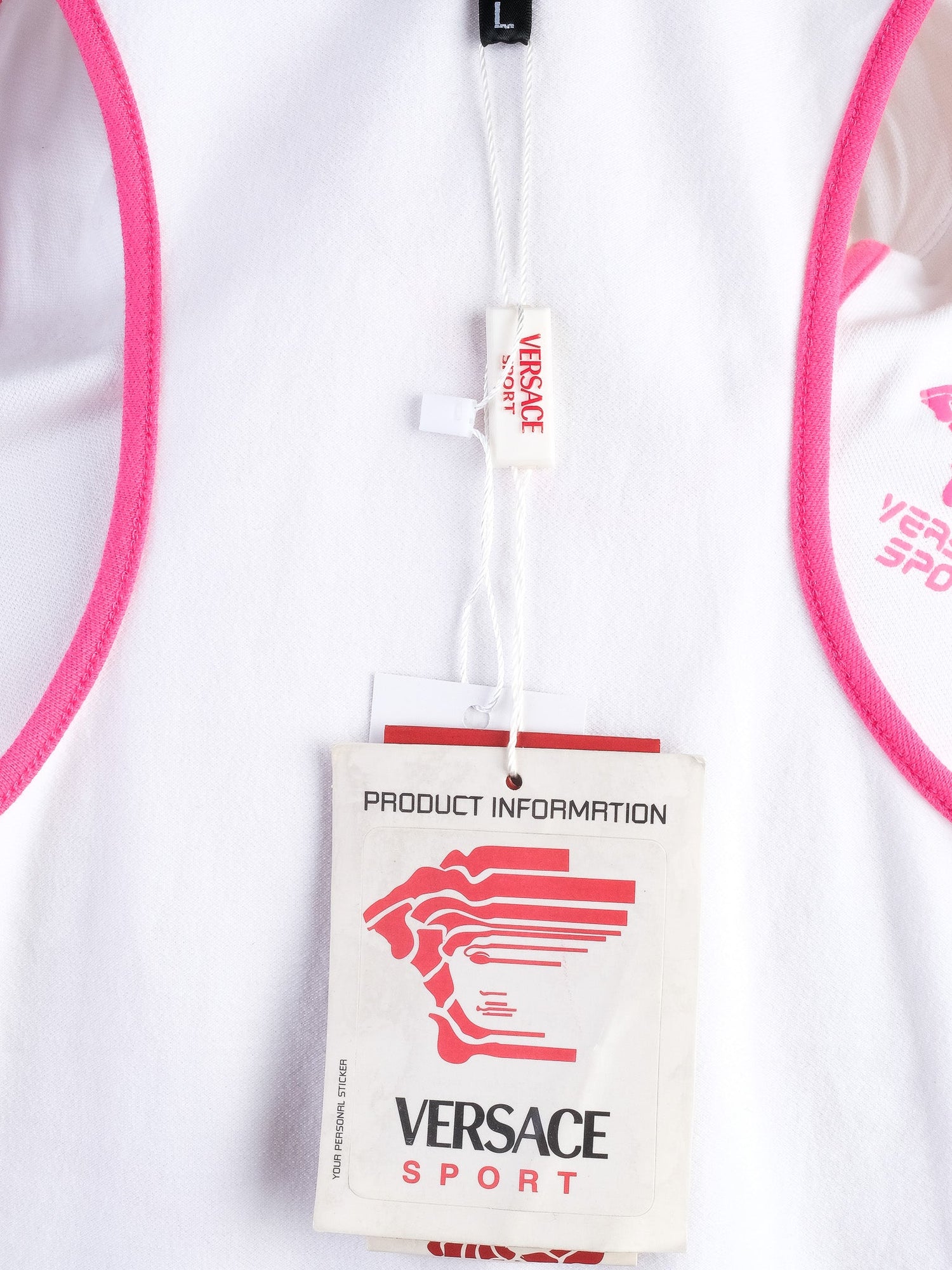 Add a touch of luxury to your wardrobe with this stunning new Versace dress. Made from natural cotton, this sleeveless design features a stylish collar and vibrant pink accents that elevate its sporty look. The dress is a size L, ensuring a comfortable fit while maintaining a chic silhouette.