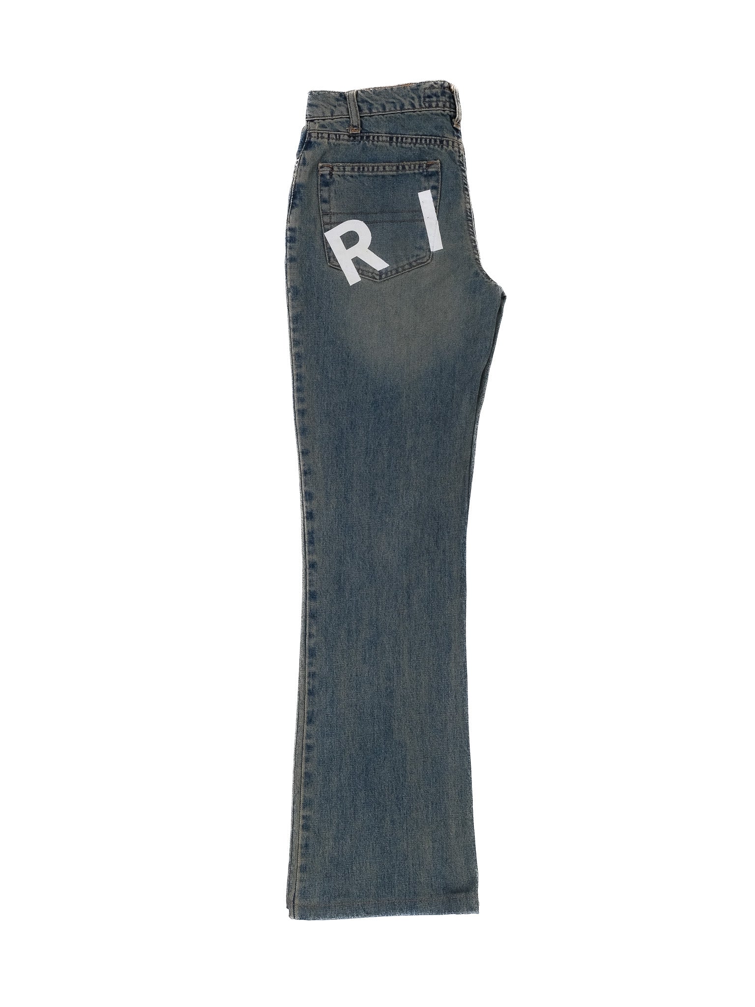 The jeans come in a size M, fitting true to size, and showcase several key details such as pockets, a zipper fly, and belt loops for added functionality. The back of the jeans is distinctively highlighted with the word 'RICH' in large, contrasting letters, adding a unique touch to the design.