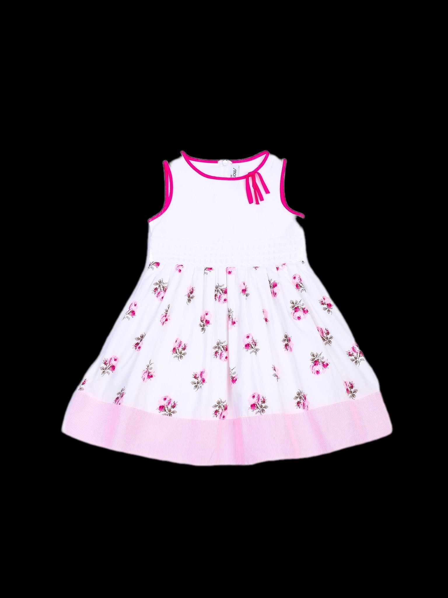 This beautiful children's dress from Simonetta is in excellent condition, showcasing a charming floral design. The dress features a bright white background adorned with lovely pink flowers and pink trims. It is sleeveless, making it perfect for warm weather occasions.