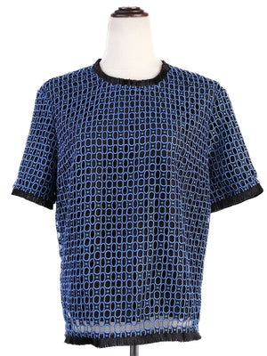 Sportmax Excellent Condition Blue Polyester Women's Top Size M. This stunning top is in excellent condition, featuring a unique blue and black circular pattern with a sheer overlay and delicate fringed edges at the neckline, sleeves, and hem. Designed for a flattering fit, this short-sleeved piece is bound to become a staple in any fashion-forward wardrobe. The size M top provides ample comfort while maintaining a stylish silhouette. Care instructions recommend dry cleaning to preserve the fabric and design integrity. Additional details include a round neckline and an eye-catching print that makes it perfect for various occasions, ranging from casual outings to semi-casual gatherings. This top is displayed on a mannequin to showcase its fit from multiple angles - front, side, and back - ensuring you see exactly what you are purchasing. Enjoy a smoke-free and pet-free environment when considering this beautiful garment. Elevate your collection with this modern Sportmax piece that blends comfort with trendsetting style. Please message me to confirm shipping timeframe. My full-time job involves traveling often, and shipping out may take longer than usual. Thanks for your interest.