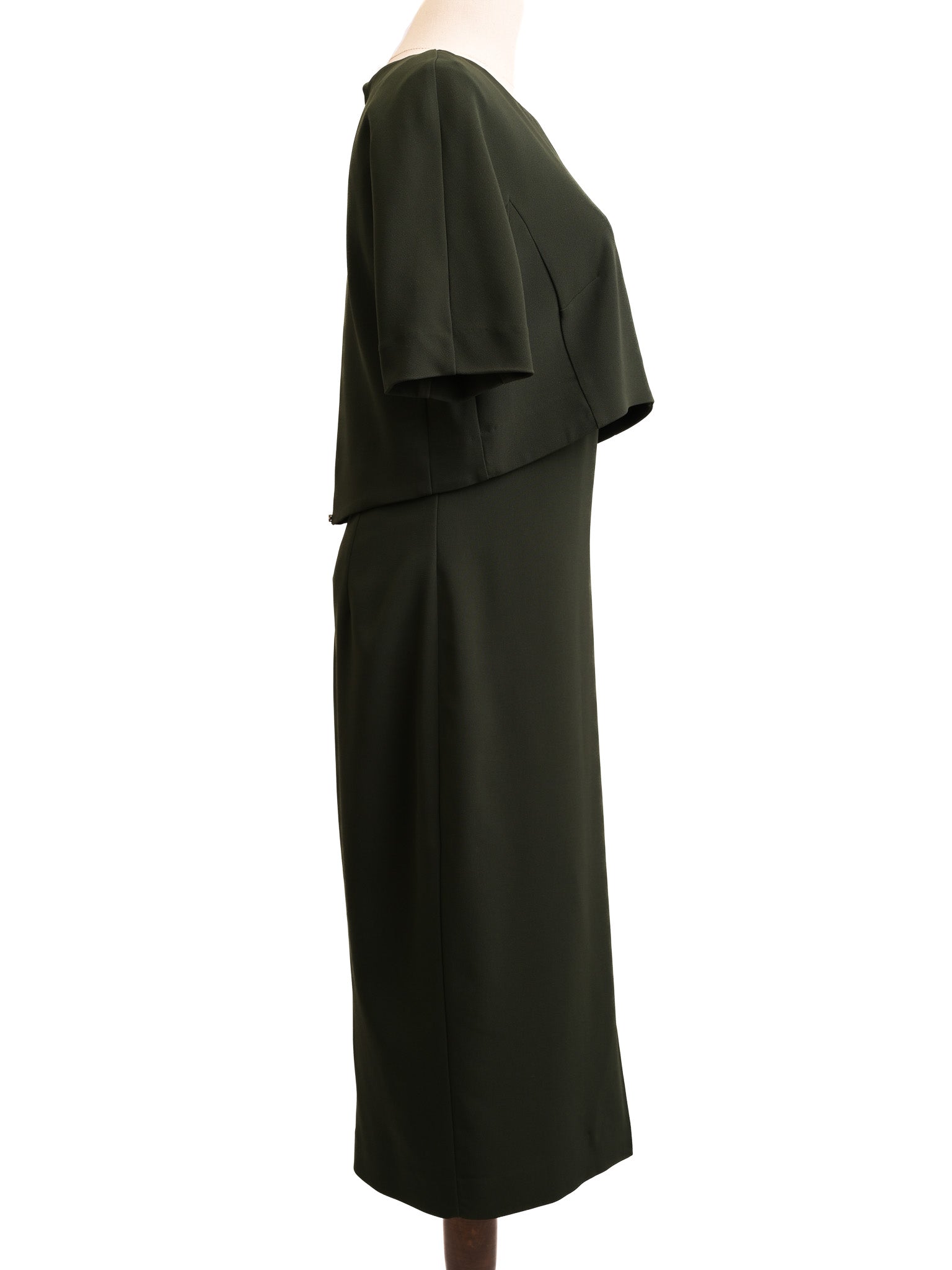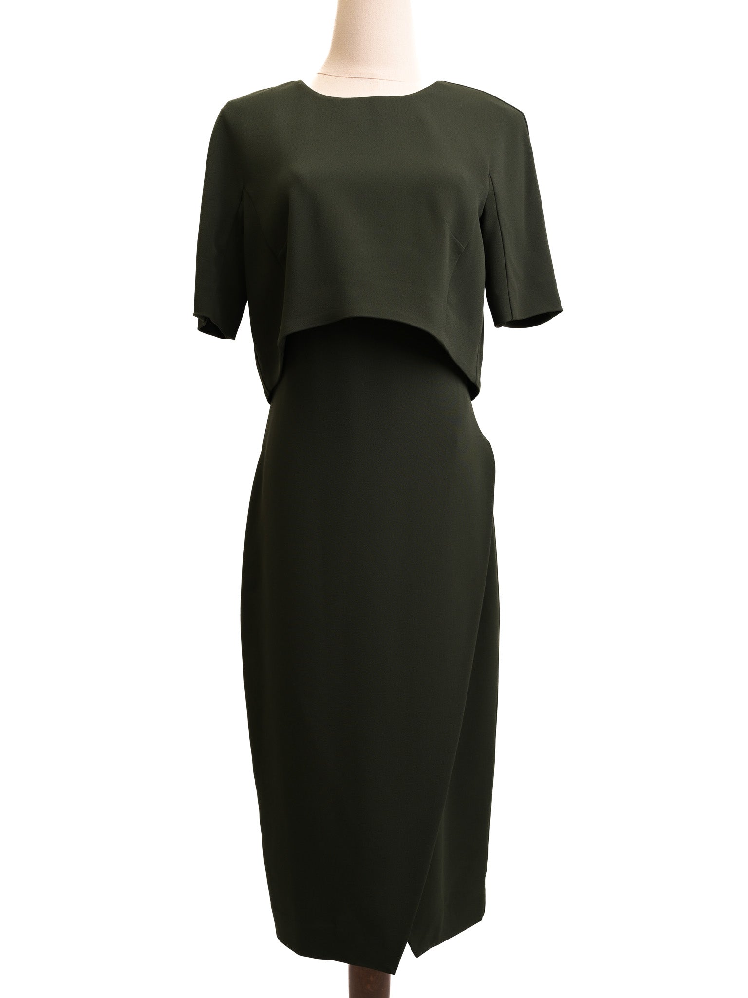 This elegant dress from the renowned brand Sportmax is in excellent condition with no visible flaws and fits true to size. The dress features a rich dark green color, perfect for various occasions, from casual outings to semi-formal events. It has a flattering layered design with an overlapping skirt section that adds movement and grace to your look.