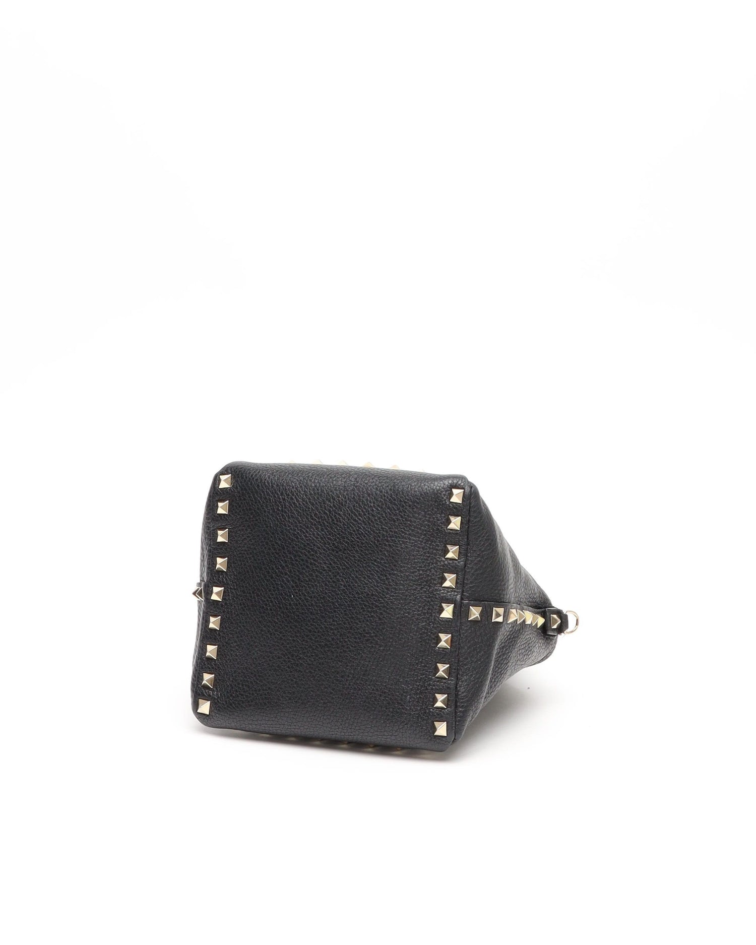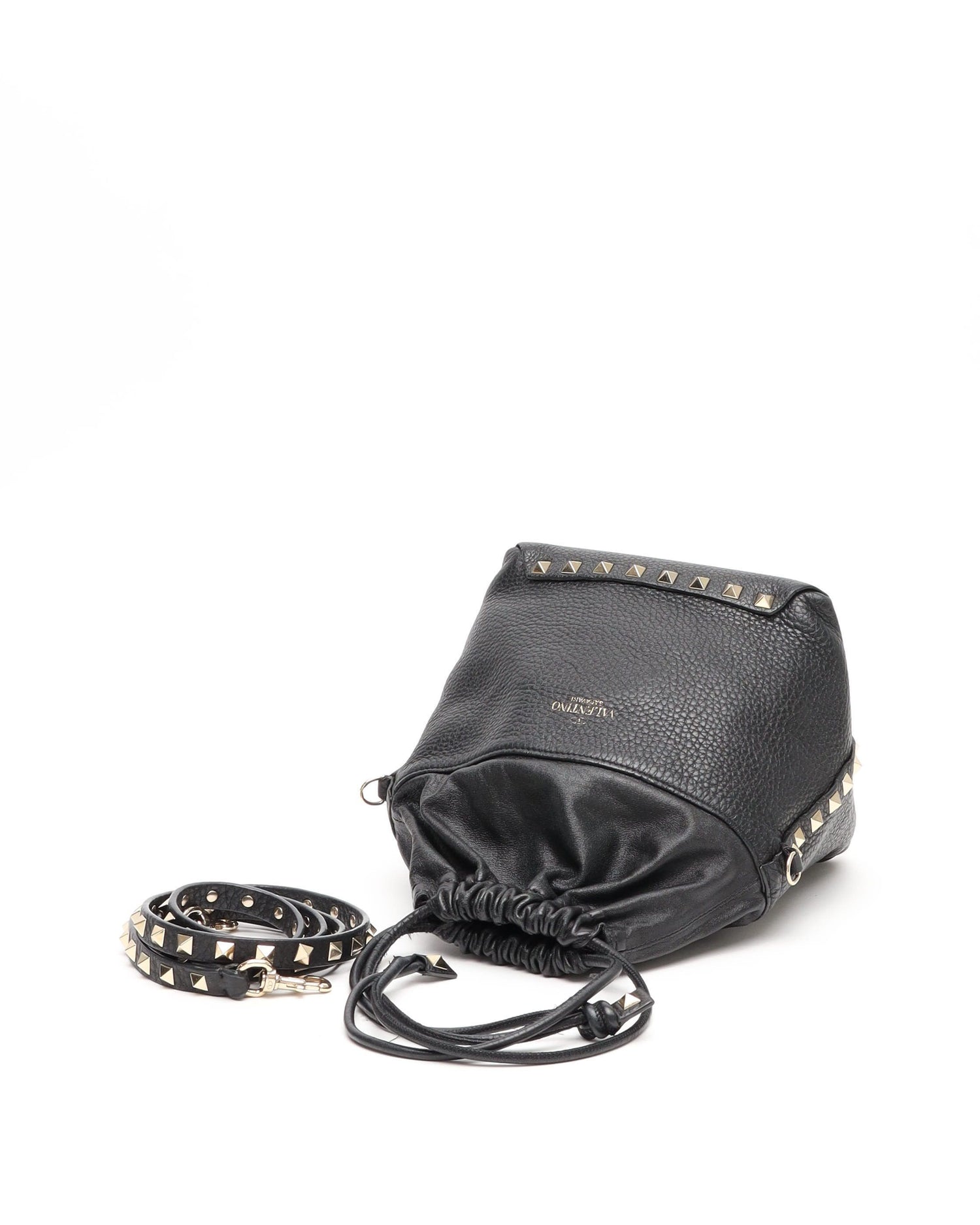 VALENTINO Rockstud Mini Bucket Bag¥ Black grained leather¥ Gold-tone hardware¥ Signature Rockstud embellishments¥ Detachable studded shoulder strap¥ Black suede lining¥ Drawstring closure¥ VintageOverall Preloved Condition: GoodExterior Condition: Good. Light trace of use.Interior Condition: Good. The lining has marks and some dirt.Hardware: Shiny with some fading on the front logo.Delivered with shoulder strapMade in ItalyDimensions:Height 15 cmWidth 19 cmDepth 8 cmHandle drop 12 cmShoulder strap drop 60 cmPlease note that the majority of our items are vintage and therefore have tales to tell unless stated otherwise. Therefore, please look at pictures, descriptions and measurements provided as they give you the best idea of the story this item has to tell.