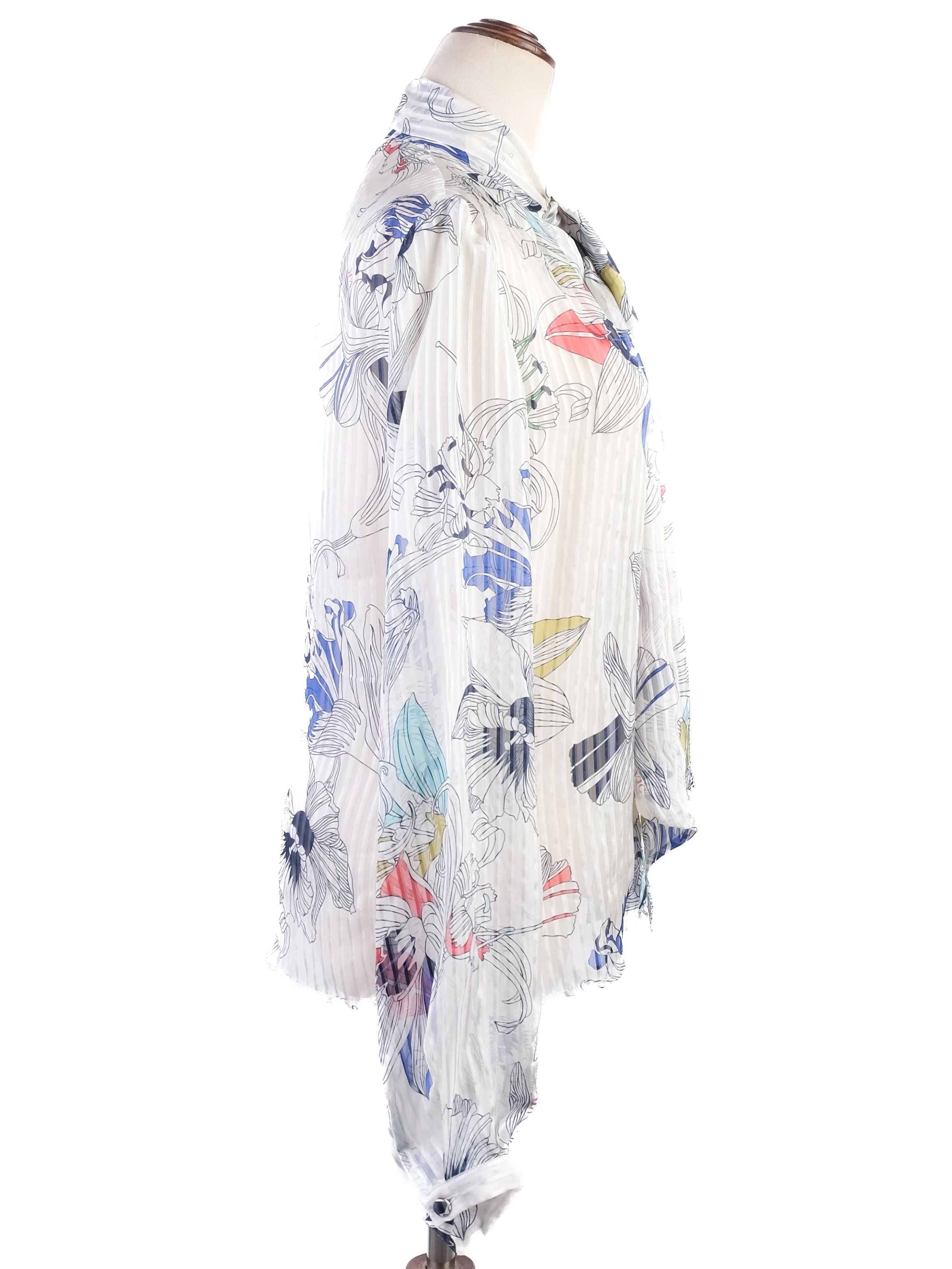 Versace Floral Silk Blouse Excellent Condition Size N/A This stunning Versace blouse features a beautiful multicolored floral design that embodies elegance and sophistication. Crafted from exquisite silk, the lightweight top has a semi-sheer appearance, perfect for elevated styling. The blouse features long sleeves and a chic tie at the neck, making it versatile for various occasions. In excellent condition, this blouse shows no signs of wear, ensuring that it is ready for a new home. Please note, it is a women's size without specific measurements provided. Complement any wardrobe with this luxurious piece that can be dressed up for evening events or worn casually for daytime outings. Ideal for those who appreciate designer fashion with a flair for floral prints. Care instructions recommend dry cleaning to maintain the integrity of the silk fabric. This item is from a smoke-free and pet-free home, ensuring a fresh and clean quality for the buyer. Please message me to confirm shipping timeframe. My full-time job involves traveling often, and shipping out may take longer than usual. Thanks for your interest.