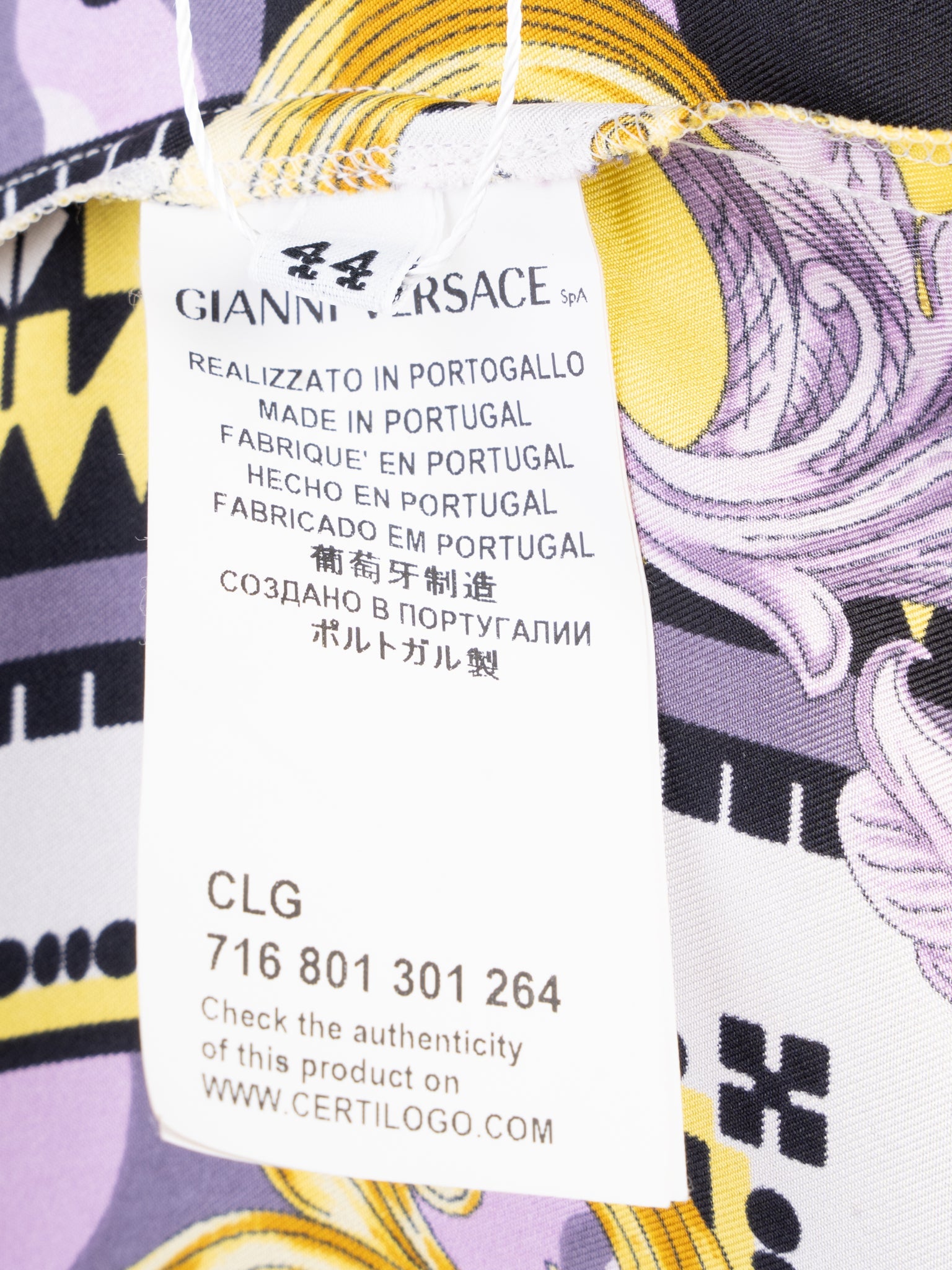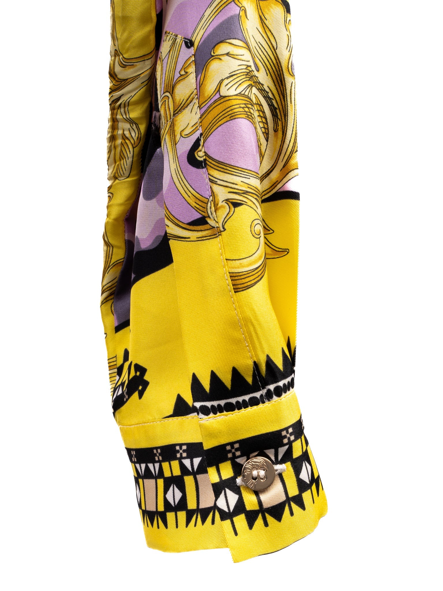 This striking long-sleeve shirt by Versace showcases a vibrant and unique design. The intricate pattern features purple camouflage, bold yellow vertical stripes, and ornate gold baroque-style swirls, creating an eye-catching piece that stands out in any wardrobe. The shirt is made from high-quality silk, ensuring a luxurious feel and drape.