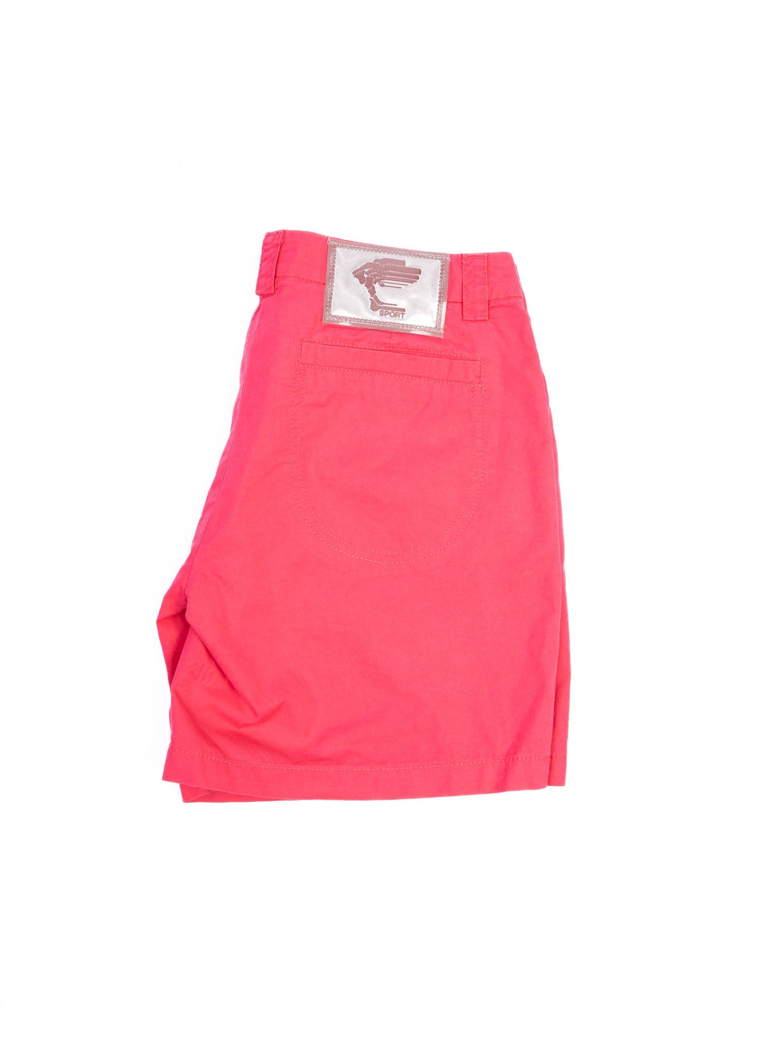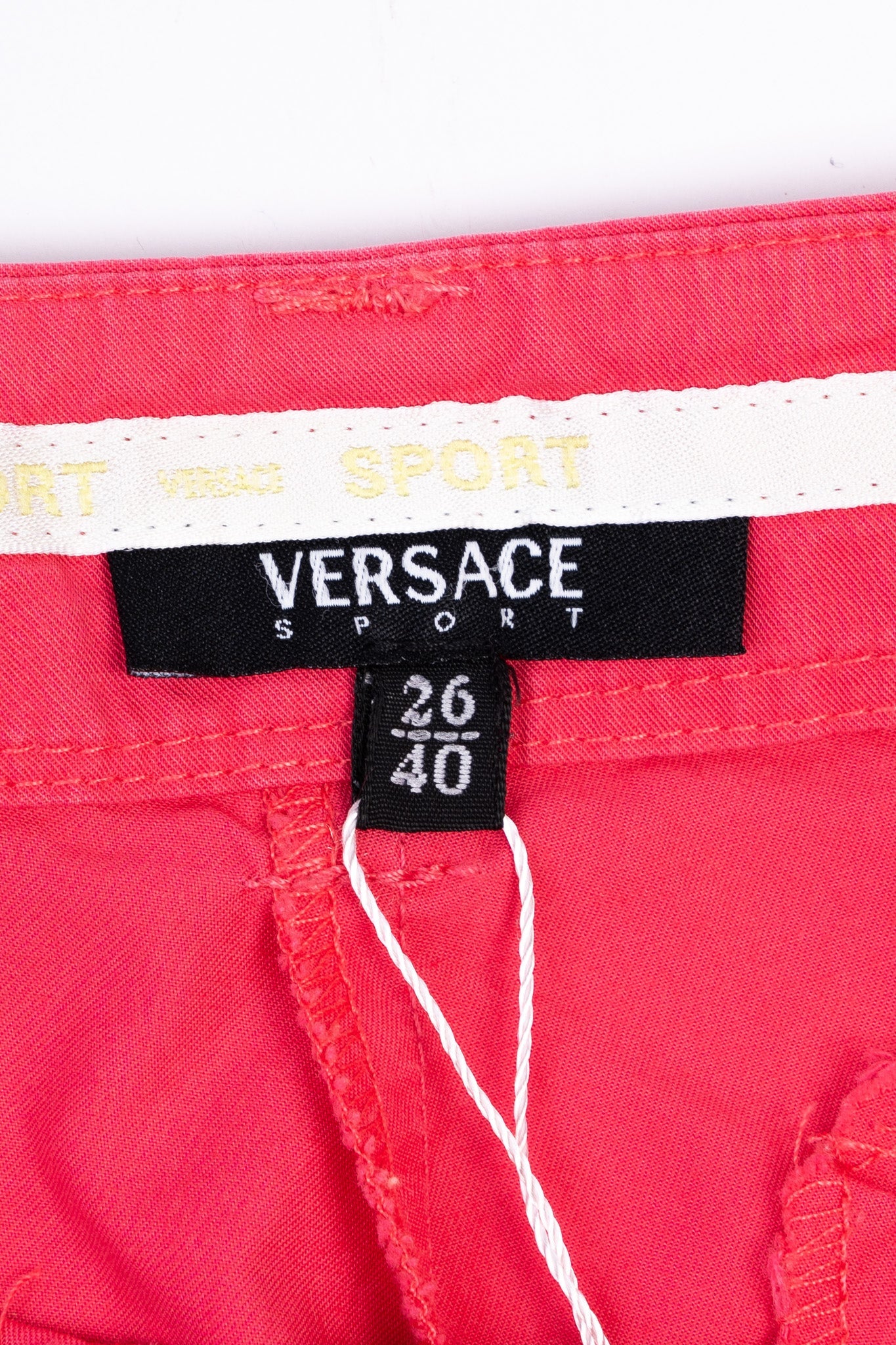 The vibrant pink color makes these shorts stand out, perfect for casual outings or relaxed summer events. They feature a flattering fit for a Size S, with an ideal length for versatile styling. The shorts include a distinctive Versace logo patch located on the back, adding a touch of luxury and brand recognition.