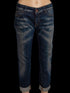 These stylish women’s jeans by Alexander McQueen feature a striking dark blue denim fabric with a faded design, perfect for a relaxed fit look. Designed in size M, these cotton jeans include turned-up cuffs and prominent stitching details on the back pockets, creating a distinctive and fashionable appeal. A stand-out element is the brown patch featuring the iconic Alexander McQueen logo located at the back waistband.