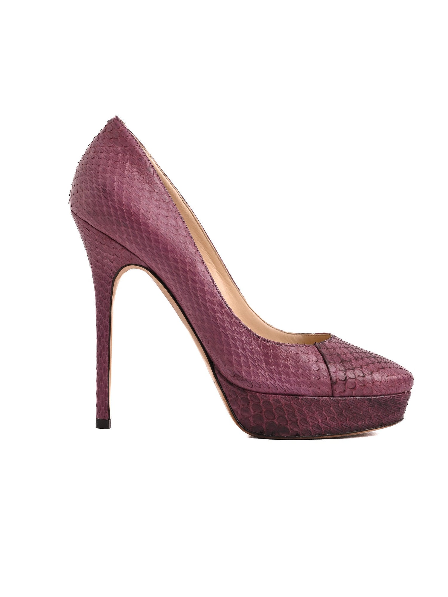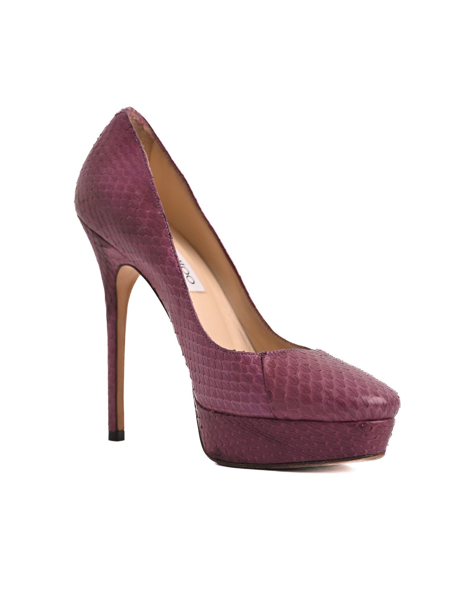 These stunning high-heeled shoes from Jimmy Choo feature a striking purple color with a luxurious snakeskin texture. The platform sole and stiletto heel create an elegant silhouette that is perfect for any special occasion or evening out.