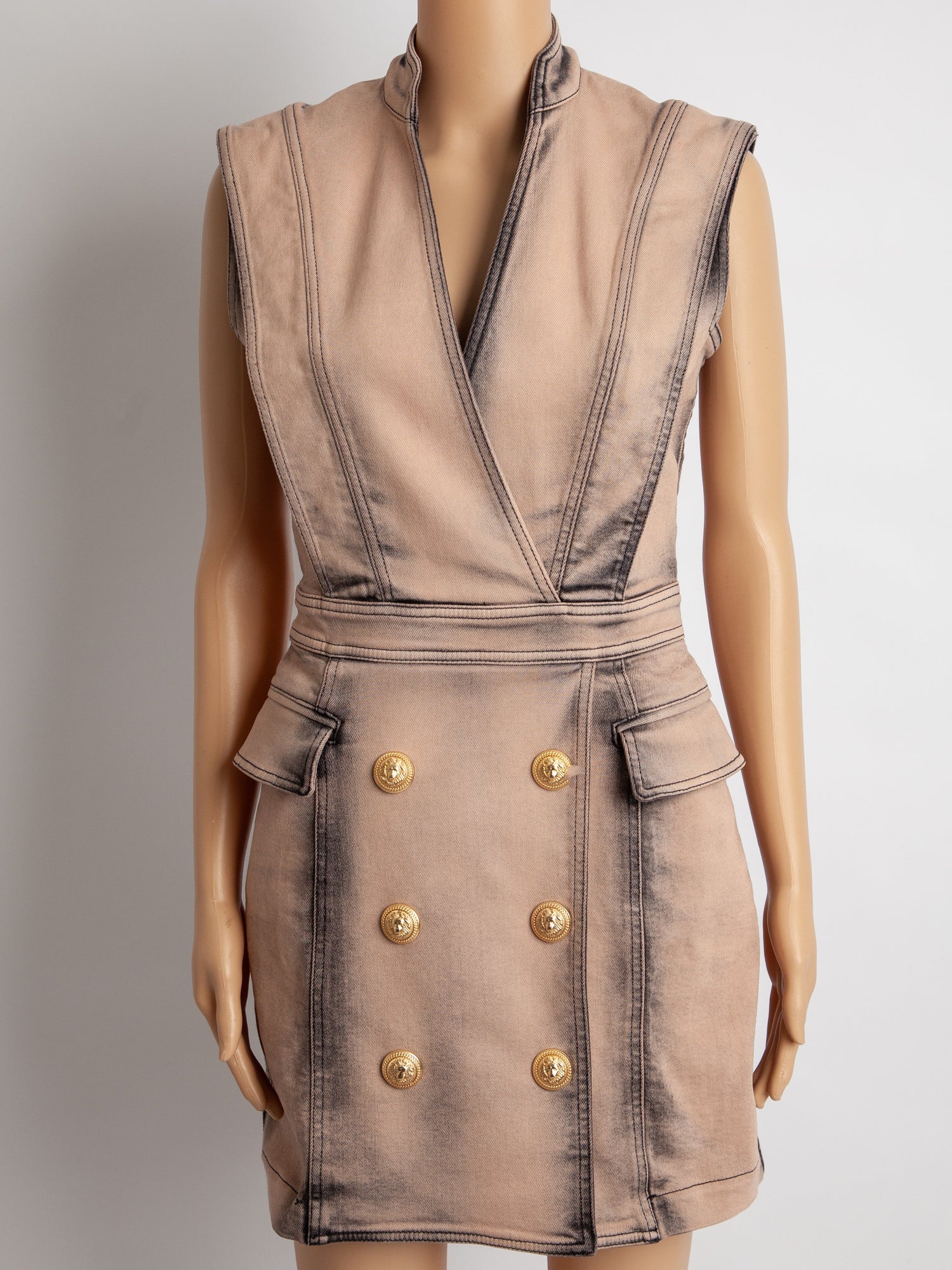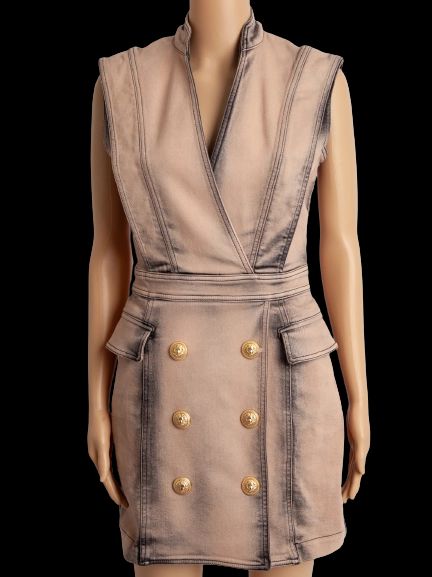 This exquisite sleeveless dress from Balmain is a standout piece for any fashion-forward woman. The dress, in a flattering pink hue, features a deep V-neck and structured shoulders that enhance its bold silhouette. The double-breasted design, adorned with prominent gold buttons, adds a touch of luxury and sophistication.