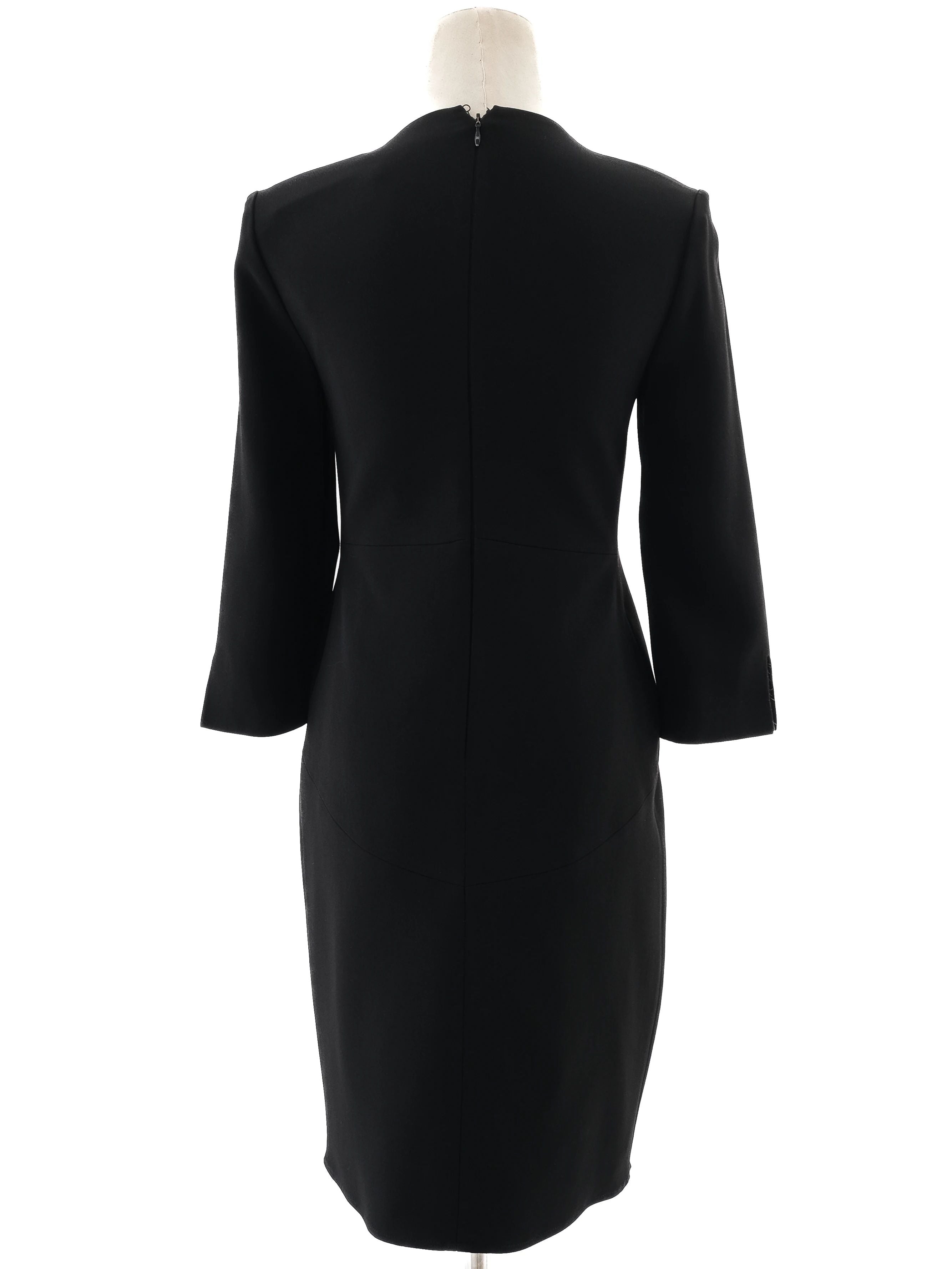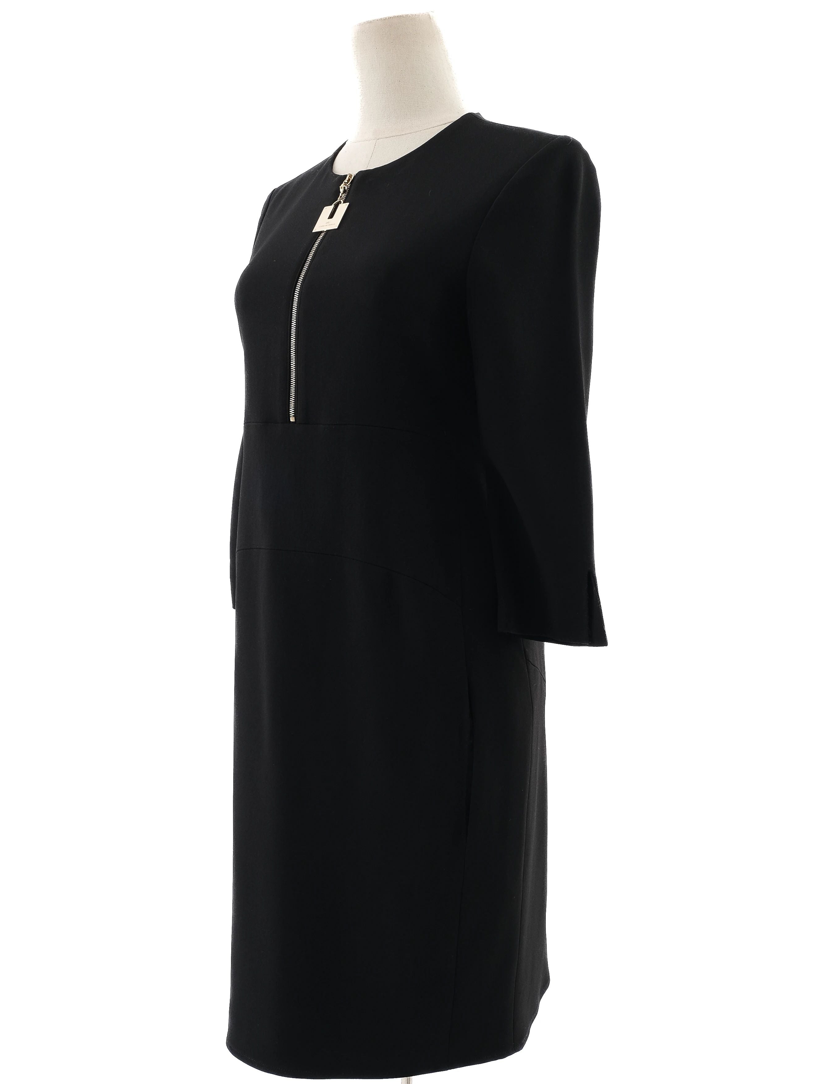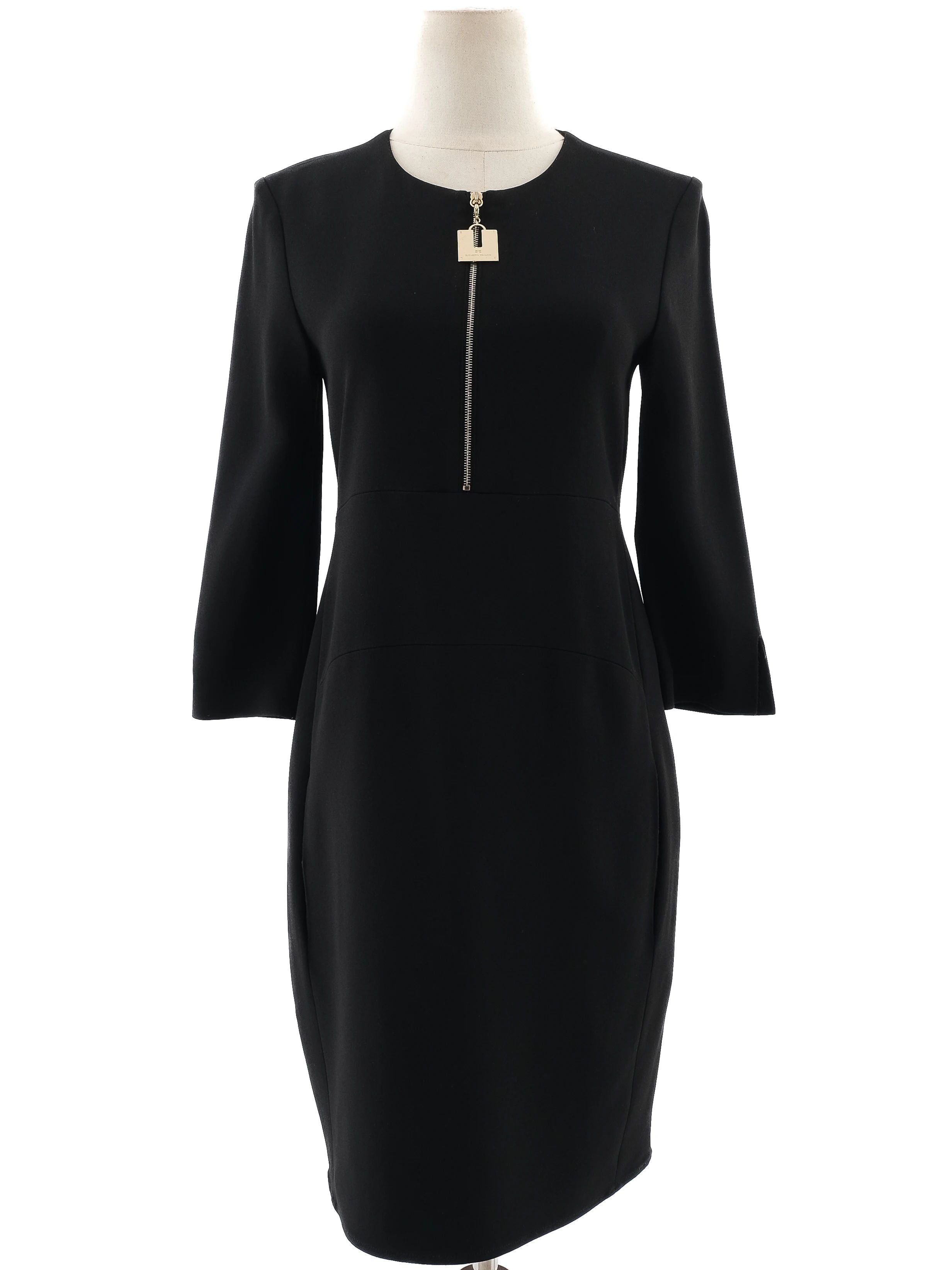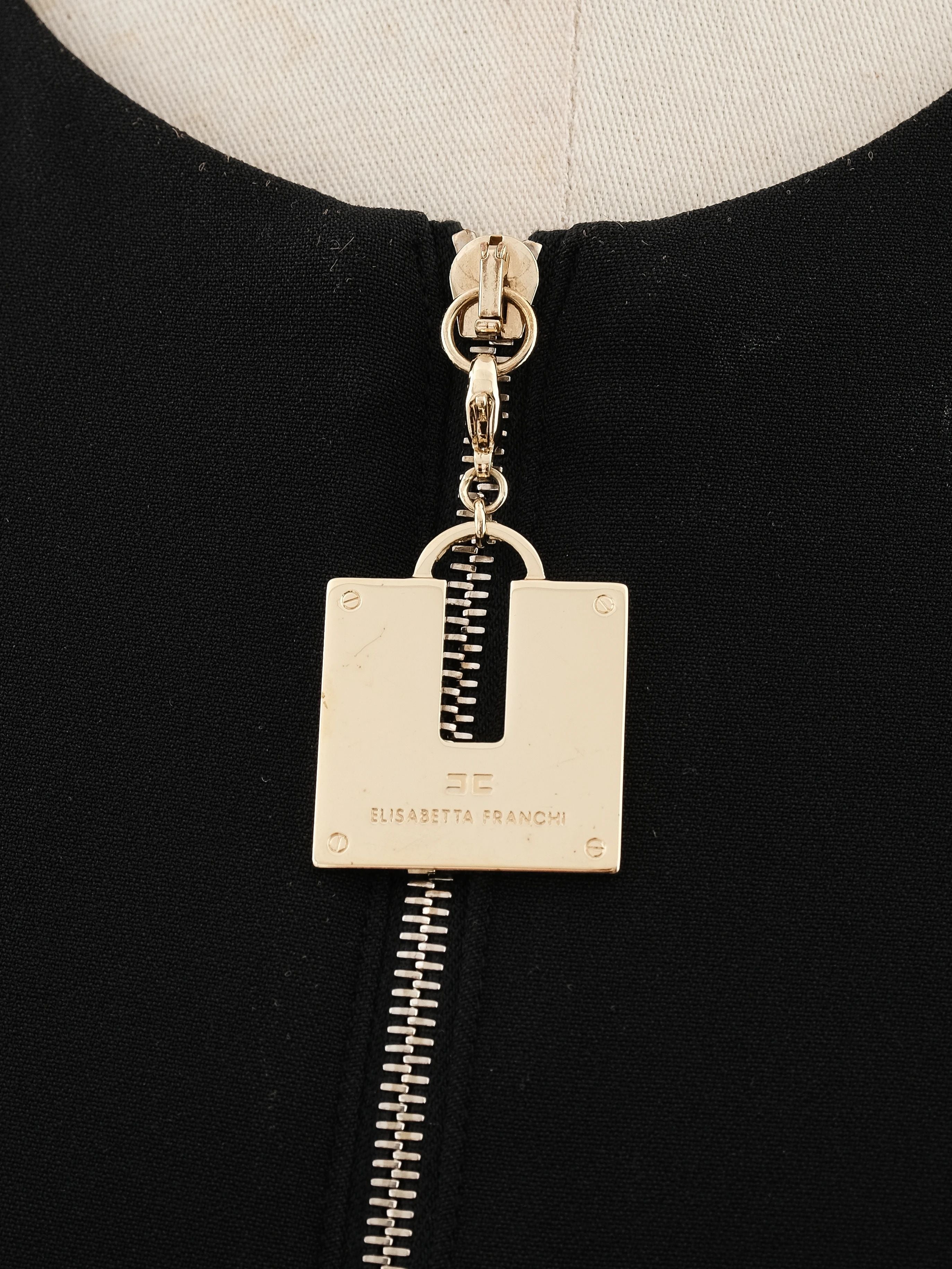 Excellent Elisabetta Franchi Black Viscose Dress Size M. This elegant black dress from Elisabetta Franchi is in excellent condition, with no flaws, and fits true to size. This timeless piece features three-quarter length sleeves and a stylish zip-up front highlighted by a gold-toned zipper pull that showcases the brand's signature logo. The dress has a classic tailored design, making it perfect for various occasions, from semi-casual outings to cocktail events. Material: 100% Viscose Care instructions: Hand wash recommended to maintain the garment's quality. Additional details include a flattering silhouette that is versatile for dressing up or down. Whether paired with heels for an evening look or with flats for a more relaxed vibe, this dress is a must-have addition to any fashion-forward wardrobe. Smoke-free and pet-free home. Please message me to confirm shipping timeframe. My full-time job involves traveling often, and shipping out may take longer than usual. Thanks for your interest.