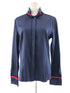 Excellent Emporio Armani Blue Silk Long-Sleeved Shirt Size M. This stunning women's shirt features a rich dark blue color with vibrant red accents, showcasing red trim along the collar and cuffs. It has a pointed collar adorned with decorative elements, making it a stylish choice for any occasion. Crafted from 100% silk, this shirt offers a luxurious feel and drape. The size M fits true to size, ensuring comfort and style for any wardrobe. Ideal for semi-casual outings or cocktail events, this long-sleeved shirt combines sophistication with modern design elements. Care instructions: Dry clean only. Additional features include long sleeves and a well-structured silhouette which accentuates the wearerÕs figure. Don't miss this opportunity to add a versatile piece from a renowned brand to your collection. Smoke free and pet free home. Please message me to confirm shipping timeframe. My full-time job involves traveling often, and shipping out may take longer than usual. Thanks for your interest.