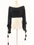 Excellent Gianfranco Ferr� Black Off-Shoulder Crop Top Size L. This stunning women's crop top features a fashionable off-the-shoulder design, perfect for adding a touch of elegance to your wardrobe. Crafted from high-quality natural cotton, it offers both comfort and style. The long, loose sleeves adorned with tassel details add a playful yet sophisticated touch, while the ribbed band around the waist ensures a flattering fit. The textured, slightly ruffled neckline enhances the overall appeal of this piece. Condition: Excellent with no visible flaws. This top fits true to size and is suitable for various occasions, whether you are dressing up for a night out or wearing it casually. Care instructions: Machine wash cold and tumble dry low for easy maintenance. Additional details: Off-the-shoulder neckline, long sleeves with tassels, and ribbed waistband. This crop top is ideal for pairing with high-waisted skirts or jeans for a chic look. A great addition to any fashion-forward woman's collection. Enjoy a smoke-free and pet-free environment with this stylish piece. Please message me to confirm shipping timeframe. My full-time job involves traveling often, and shipping out may take longer than usual. Thanks for your interest.