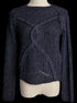 Featuring a unique cable knit pattern on the front, this navy blue long-sleeve sweater is both stylish and comfortable, perfect for layering during the colder months.
