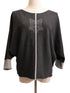 The sweater features a unique rhinestone design of an animal's face, adding a trendy touch that captures the eye. The dark gray base is beautifully complemented with light gray accents, which are visible in the cuffs and the vertical stripe down the front, making it both fashionable and versatile, suitable for various occasions.
