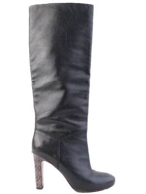 Excellent Marc Jacobs Black Leather Knee-High Boots with High Heel. These stunning knee-high boots from Marc Jacobs are crafted from premium black leather, characterized by their sleek design and sturdy high heel. The textured heel features an eye-catching snake-skin pattern, adding a sophisticated touch to your wardrobe. Condition is excellent, showcasing minimal signs of wear, perfect for any fashion-forward individual. The versatility of these boots allows them to be paired with both casual and semi-casual outfits, making them an essential addition to your collection. Key Features: - Brand: Marc Jacobs - Color: Black - Material: 100% Leather - Style: Knee-high with high heel - Closure: Slip-on style for easy wear Care Instructions: - Clean with a leather cleaner and maintain with appropriate products for longevity. Don't miss your opportunity to own these exquisite boots, perfect for elevating your style on any occasion. Please message me to confirm shipping timeframe. My full-time job involves traveling often, and shipping out may take longer than usual. Thanks for your interest.