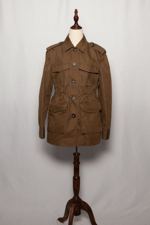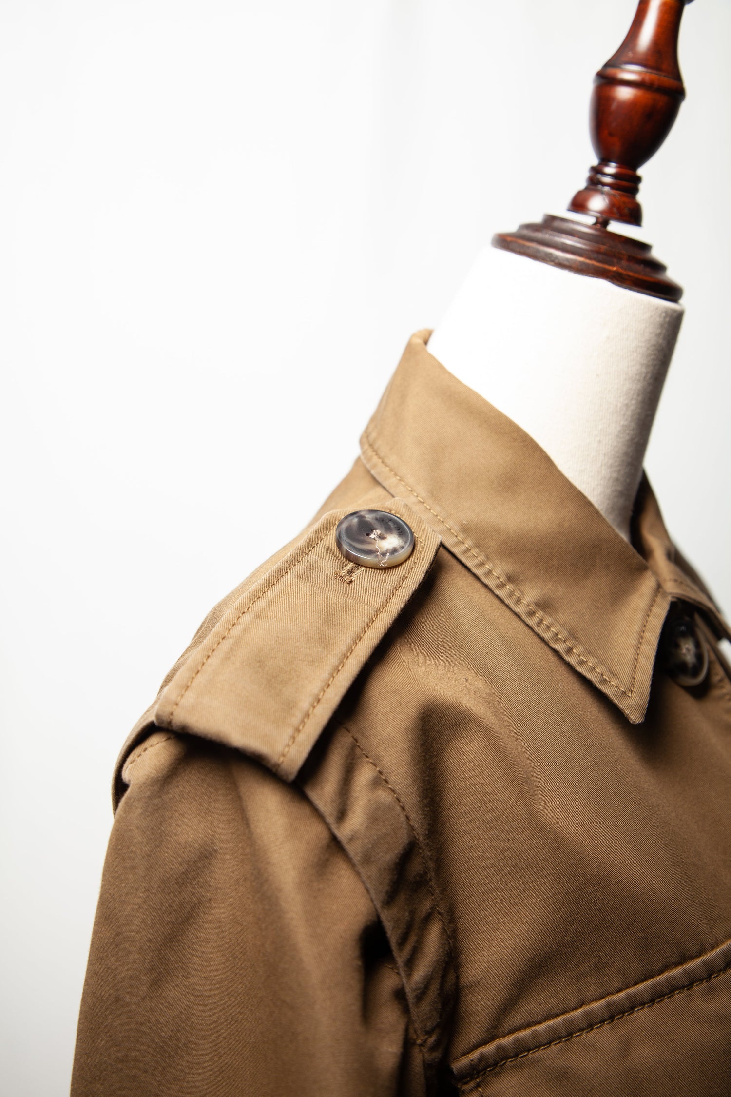 The jacket is crafted from natural cotton, ensuring both comfort and durability. It features classic military details such as shoulder epaulettes, a button-down front, and flap pockets, making it a practical yet fashionable choice for any occasion.