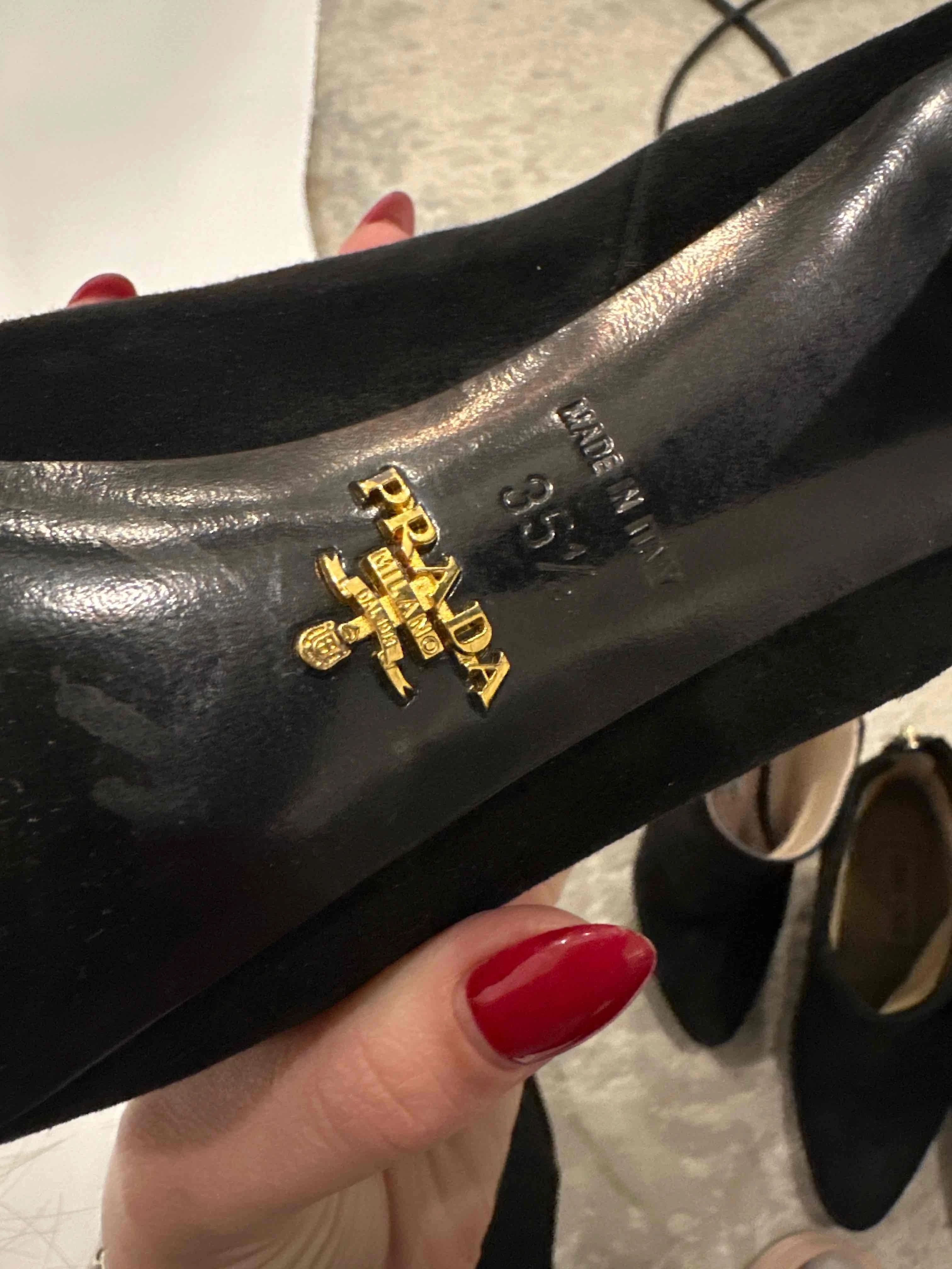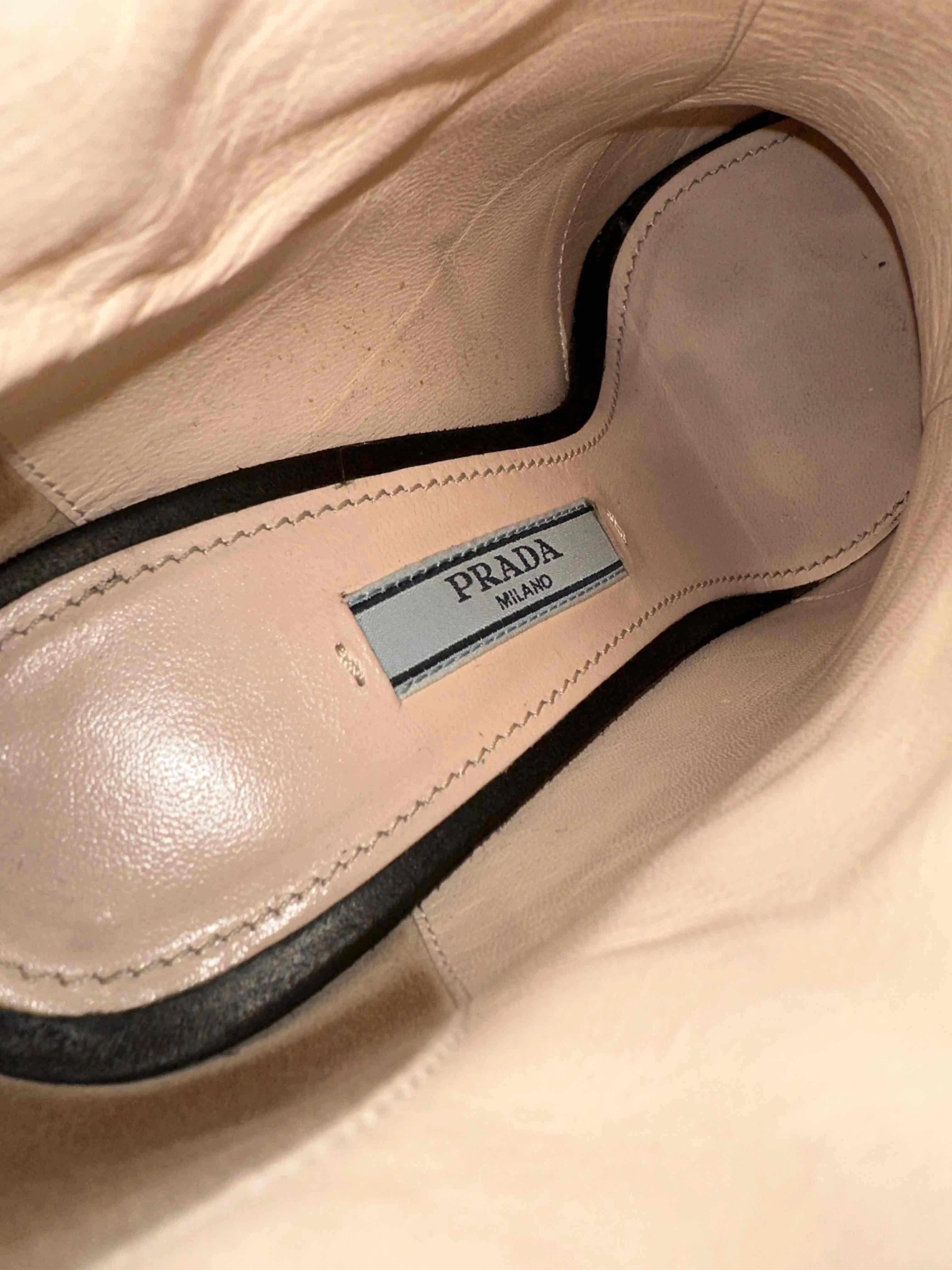 Excellent Prada Black Leather High-Heeled Ankle Boots Size 35.5. This stunning pair of high-heeled ankle boots from Prada showcases an elegant design and luxurious craftsmanship. Made in Italy, these boots feature a sleek black leather upper that exudes sophistication, perfect for any occasion, whether casual or dressy. The inner lining is a soft beige material, prominently featuring the iconic 'Prada Milano' label, which adds an extra touch of authenticity. The soles are adorned with a gold Prada logo, indicating the high-quality craftsmanship and attention to detail that the brand is known for. In terms of sizing, these boots are marked as size 35.5, offering a comfortable fit for those who wear this size. They feature high heels that elevate your look while ensuring you stand out. These boots are in excellent condition, displaying no flaws, making them a fantastic addition to any fashion-forward wardrobe. The versatility and style of these Prada ankle boots ensure they can be paired with a range of outfits, from jeans to dresses, providing endless styling possibilities. Maintenance is simple; just use a leather cleaner to keep them looking pristine. Enhance your shoe collection with this exquisite pair of Prada ankle boots that combine luxury with timeless style. Please message me to confirm shipping timeframe. My full-time job involves traveling often, and shipping out may take longer than usual. Thanks for your interest.
