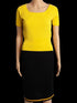 This stylish two-piece outfit from Prada features a vibrant yellow ribbed short-sleeve top paired with a chic black ribbed skirt that boasts a trendy yellow stripe at the bottom. This outfit is perfect for various occasions, offering both comfort and sophistication.