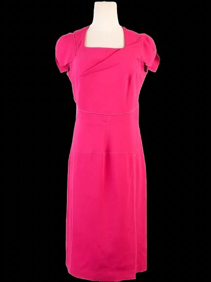 Excellent Roland Mouret Pink Viscose Dress Size XL Square Neckline This striking pink dress from renowned designer Roland Mouret is an exquisite addition to any wardrobe. In excellent condition, this dress features a square neckline and an elegant asymmetrical design that flatters the figure beautifully. The fitted silhouette enhances the body's natural shape, while the knee-length hem ensures a stylish and sophisticated look. Crafted from high-quality viscose, the dress offers both comfort and elegance, making it perfect for various occasions from casual outings to semi-formal events. The short sleeves add a chic touch, and the detailed seams and sleeve accents contribute to its overall design interest. The back of the dress is equipped with a reliable zipper closure for a secure fit. This piece is available in size XL, suitable for those looking for a flattering and fashionable option. Care instructions recommend dry cleaning to maintain the dress's vibrant color and structure. Don't miss this opportunity to own a classic Roland Mouret piece that radiates elegance and style. Please message me to confirm shipping timeframe. My full-time job involves traveling often, and shipping out may take longer than usual. Thanks for your interest.