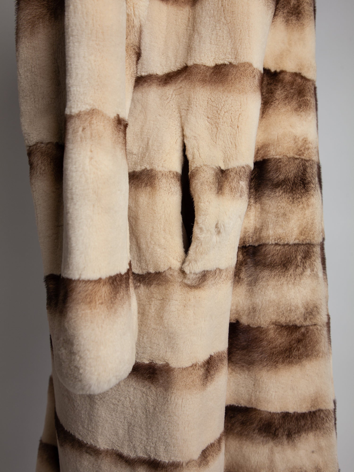 This stunning long fur coat by Scandinavia is in excellent condition and features a unique design with horizontal brown stripes set against a light beige background. The plush texture provides both comfort and style, making it an ideal choice for colder seasons.