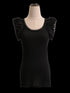 The top features elegant ruffled details on the shoulders, providing a sophisticated silhouette that is perfect for various occasions.