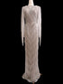The gown showcases intricate beading and fringe details that catch the light, creating a shimmering effect that elevates your evening wardrobe. The deep V-neck back adds a touch of allure and sophistication, making it an ideal choice for evening events, galas, or weddings.