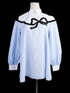 This beautiful blouse from Weekend MaxMara is in excellent condition with no visible flaws. The stylish light blue and white striped design is complemented by a classic white collar featuring charming black ribbon detailing. Long sleeves with cuffs elevate this blouse’s elegance, while the prominent black bow design across the front adds a sophisticated touch. The back also showcases a continuation of the stylish black ribbon detailing, making this piece perfect for both casual and semi-casual occasions.