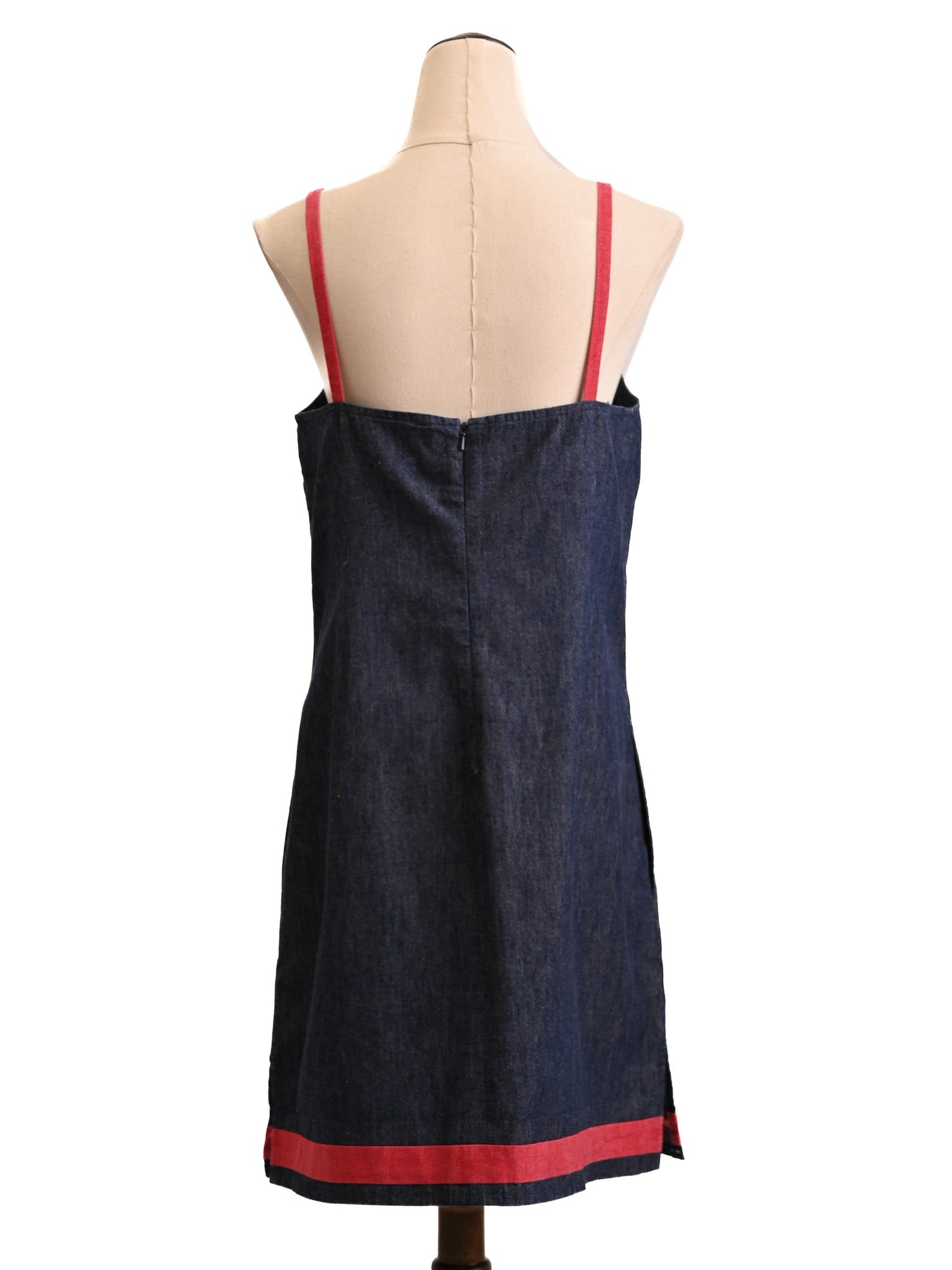 This stylish apron dress showcases a dark denim fabric, perfect for casual or semi-casual occasions. The dress features vibrant red straps and a striking red stripe near the hem, bringing a fun contrast to the classic blue hue. It has a practical front pocket, ideal for carrying small essentials.