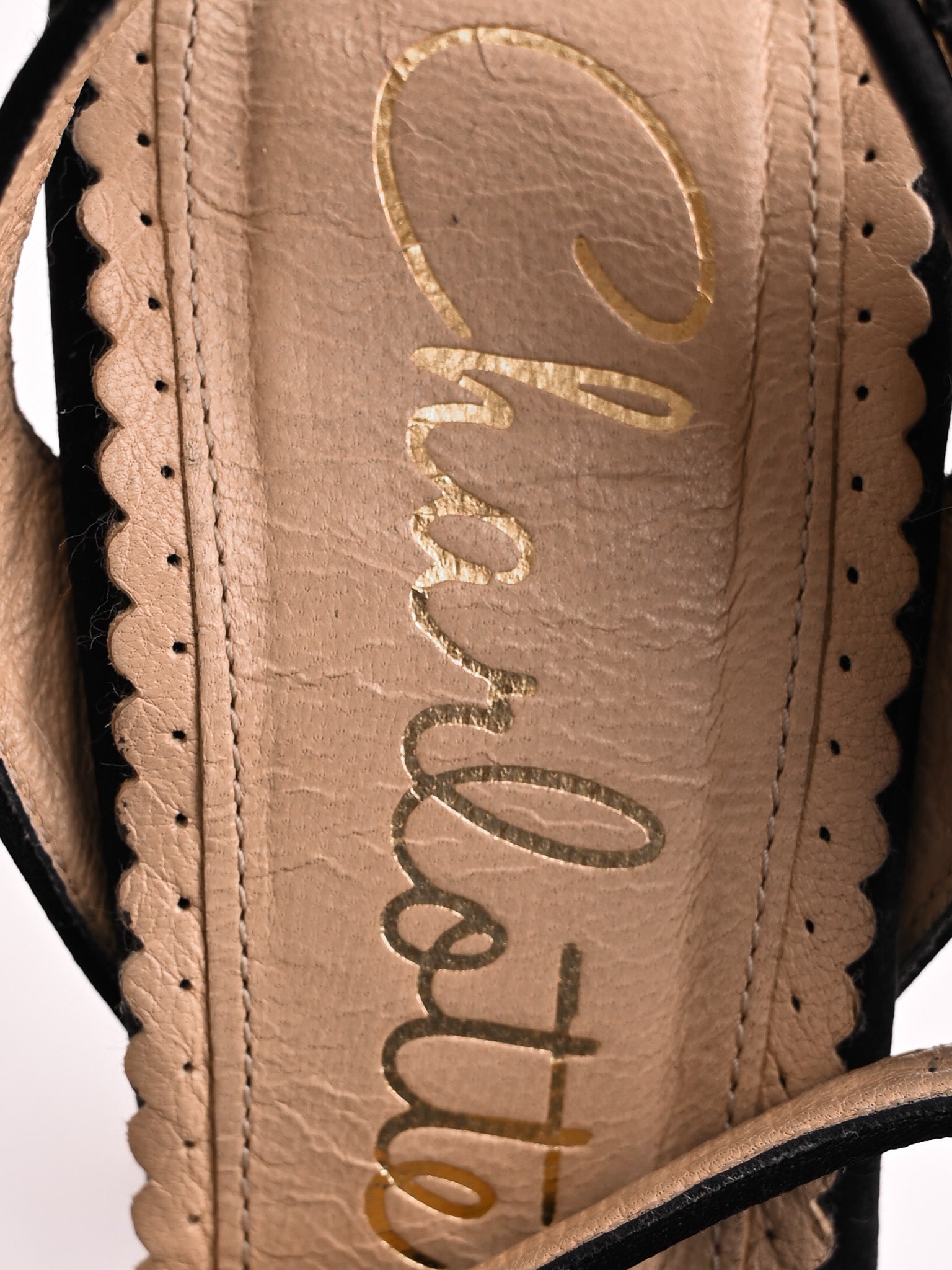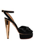 Stylish and elegant, these high-heeled platform sandals by Charlotte Olympia feature a sleek black leather upper that provides durability and comfort. The standout metallic gold heel adds a luxurious touch, while the peep toe design enhances breathability and style. These sandals include an ankle strap for a secure fit, making them perfect for evening events or special occasions.