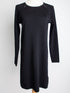 The dress features a sleek black color that enhances its elegant design. The zippers near the shoulder seams add a unique touch, giving it a modern flair while remaining versatile. It is designed to fit true to size (XS) and offers a semi-fitted silhouette that flatters the figure without being too tight.