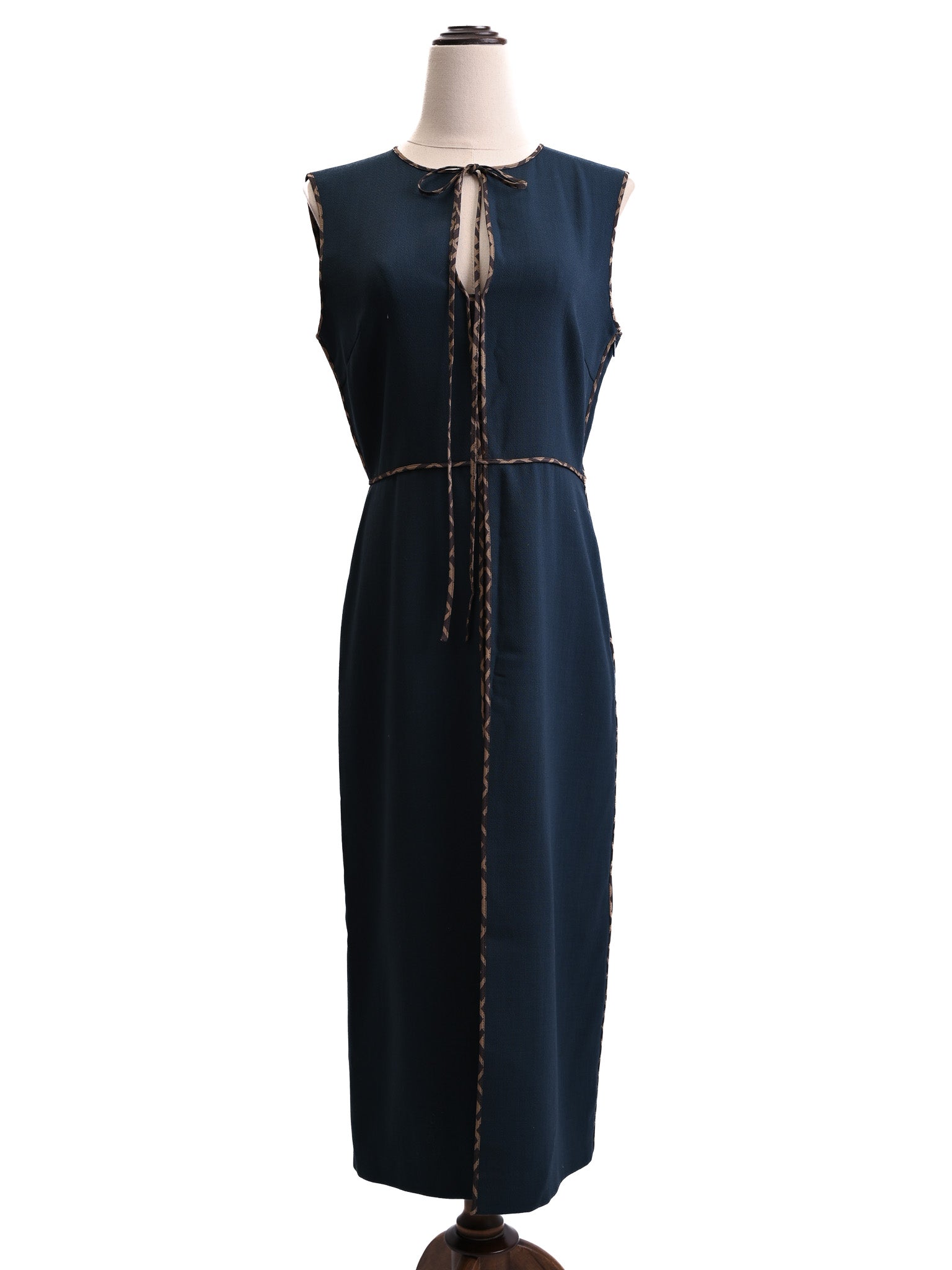 This stylish Fendi sleeveless dress offers an elegant gray color enhanced with decorative trim around the edges. The dress features a stylish tie at the neck, adding a touch of refinement to your wardrobe. It is in good condition, showing minimal signs of wear, making it a perfect addition for fashion enthusiasts.