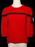 The sweater features a striking design with distinctive black loops adorning the upper chest and sleeves, complemented by black ribbons tied stylishly on one side. The piece is designed with a classic round neckline and three-quarter length sleeves, providing an elegant silhouette.