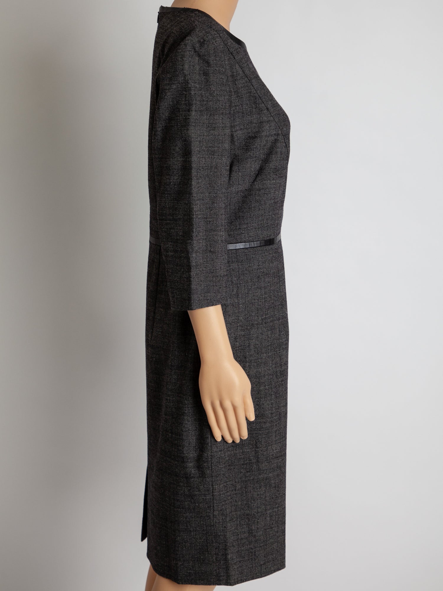 This stylish dress in a dark gray hue is crafted by the renowned brand Hugo Boss and is perfect for various occasions, from casual outings to semi-casual events. The dress features a fitted silhouette that flatters the figure, with design accents of vertical and horizontal lines adding a unique touch.