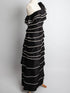 In good condition, this dress has been well-maintained and remains a fashionable addition to any wardrobe. It features a striking combination of black fabric accented with white trim, adding sophistication to the overall look. While there may be minor signs of wear, this dress is ready to make a statement at your next event.