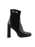 These stylish ankle boots feature a black leather upper combined with textured fabric and a rounded toe design. The thick heel provides both comfort and stability, making them perfect for various occasions. The ankle boots are adorned with a metallic Renzoni brand plate on the side, showcasing their quality craftsmanship.