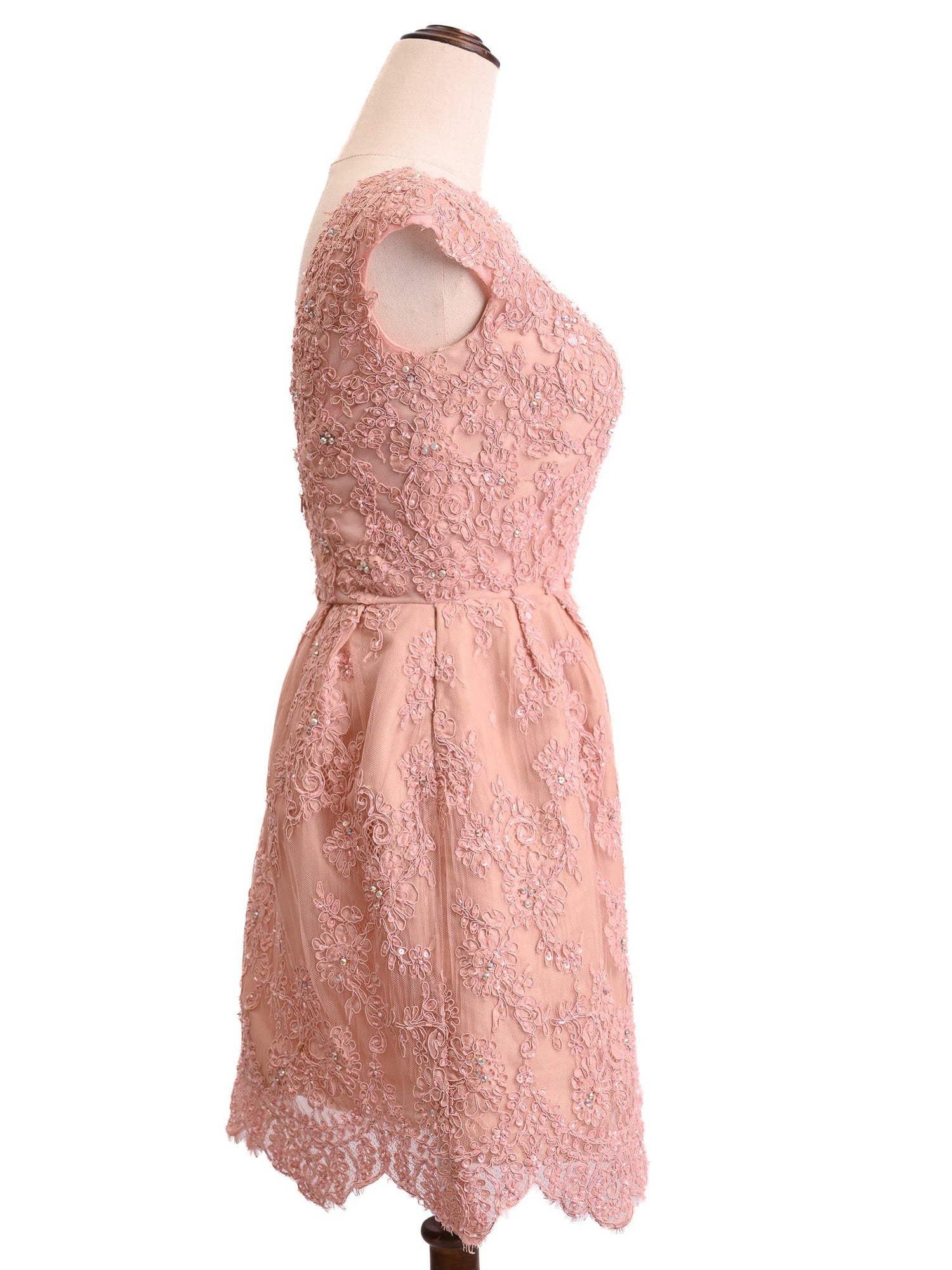 This exquisite pink lace dress by Sherri Hill is in excellent condition, showcasing intricate floral lace detailing that adds a touch of elegance. The fitted bodice beautifully complements a full skirt, creating a flattering silhouette for various occasions.